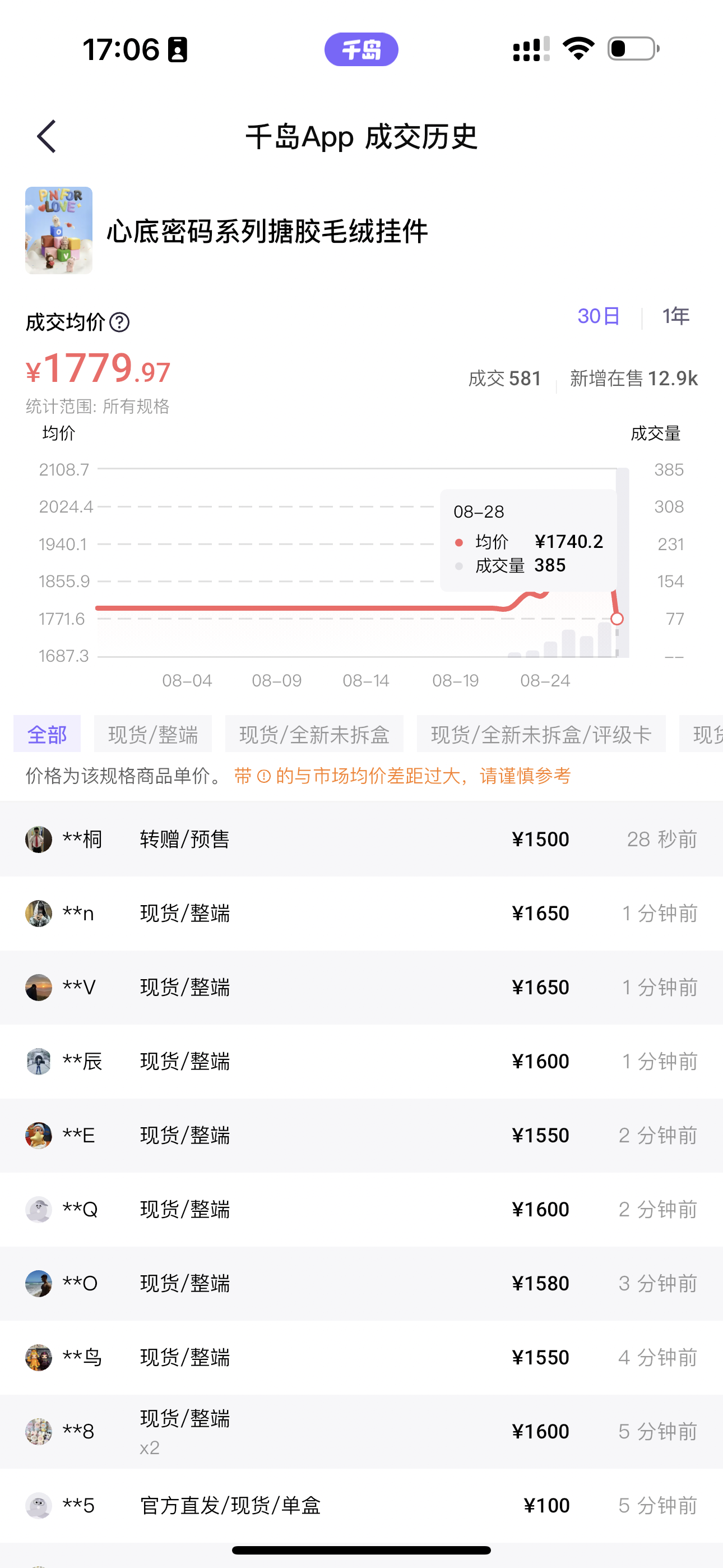 然而正式發售後,該款盲盒的二手價格較發售前有所回落。截至發稿,該系列盲盒成交均價在1779元左右,隱藏款的二手均價則在701.4元,較發售前1000元以上的高價也有大幅回落。其中,整端盲盒的成交價在1500元至1800元不等,較發售前的2000元以上的高價有所回落,單個盲盒的售價則在98元至141元之間,也比發售前200元上下的均價有所下降。