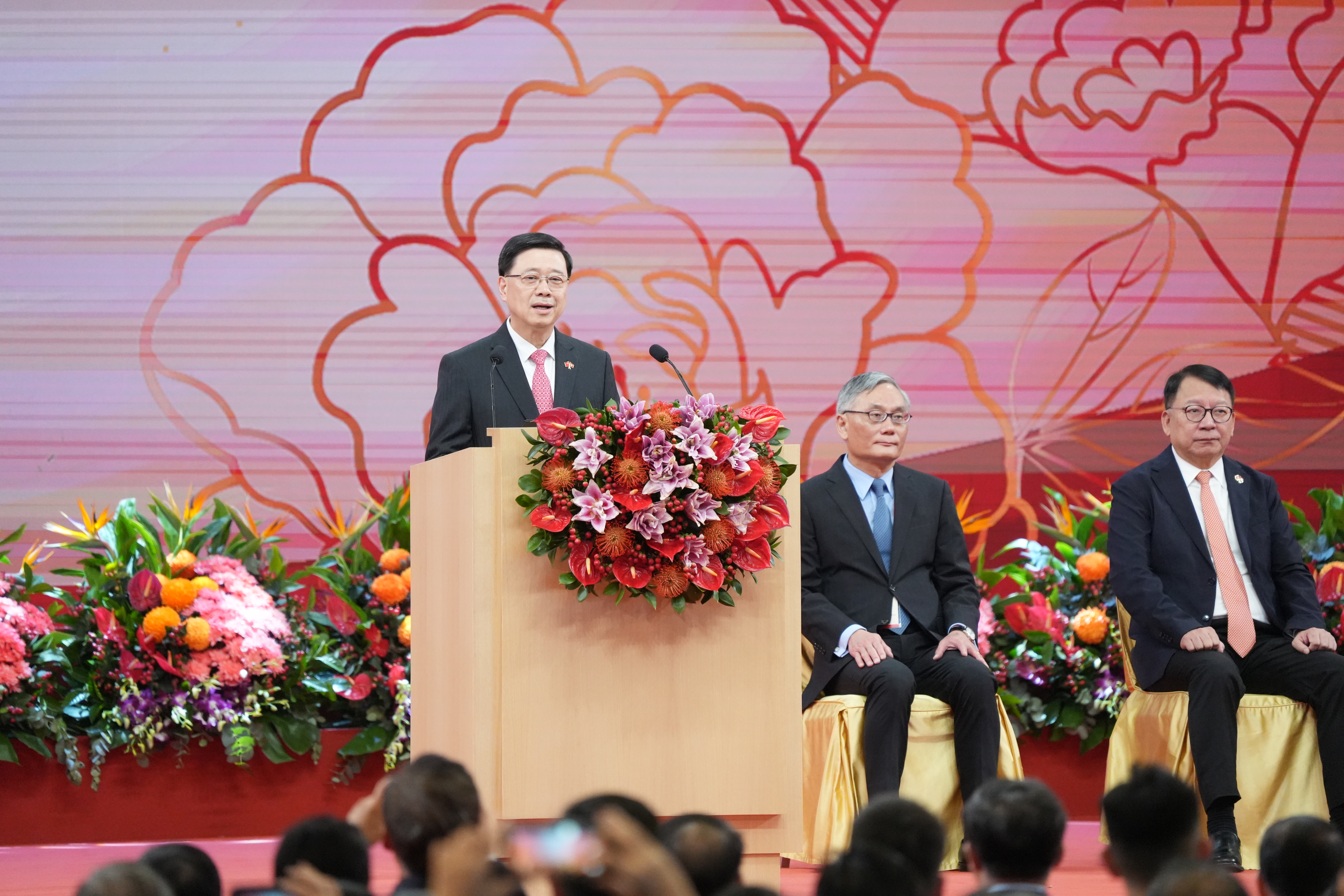【識港網訊】今日(10月1日)是中華人民共和國成立76周年國慶日,特區政府今早分別在灣仔金紫荊廣場和香港會議展覽中心舉行升旗儀式和國慶酒會,慶祝中華人民共和國成立76周年。行政長官李家超出席升旗儀式,並為國慶酒會主禮。