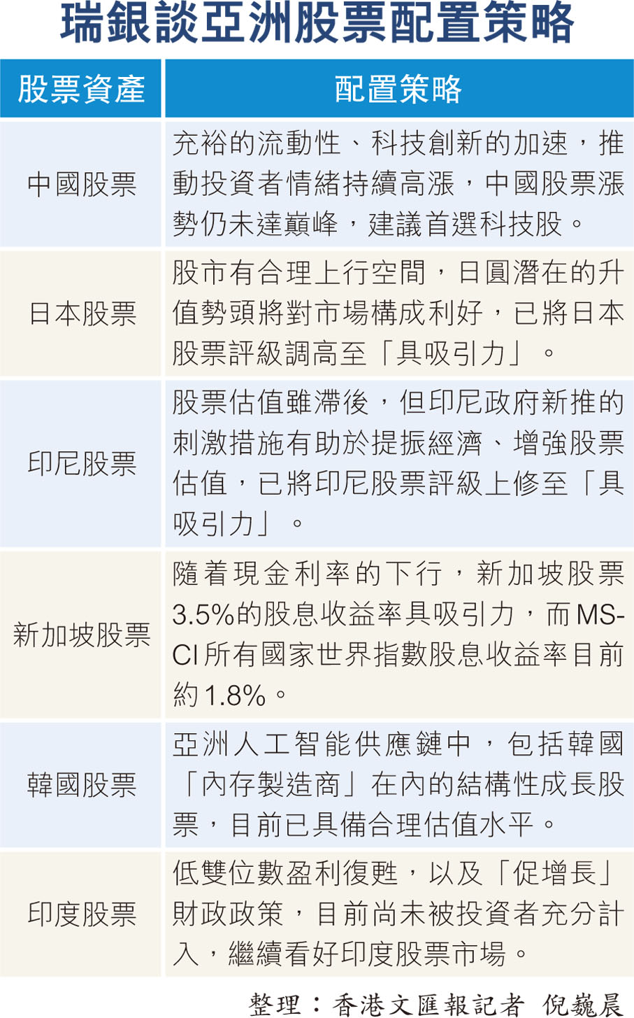 瑞銀看好亞洲投資