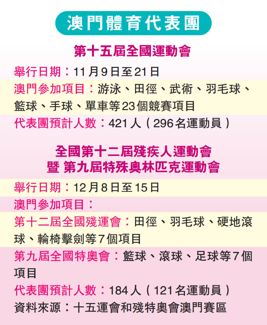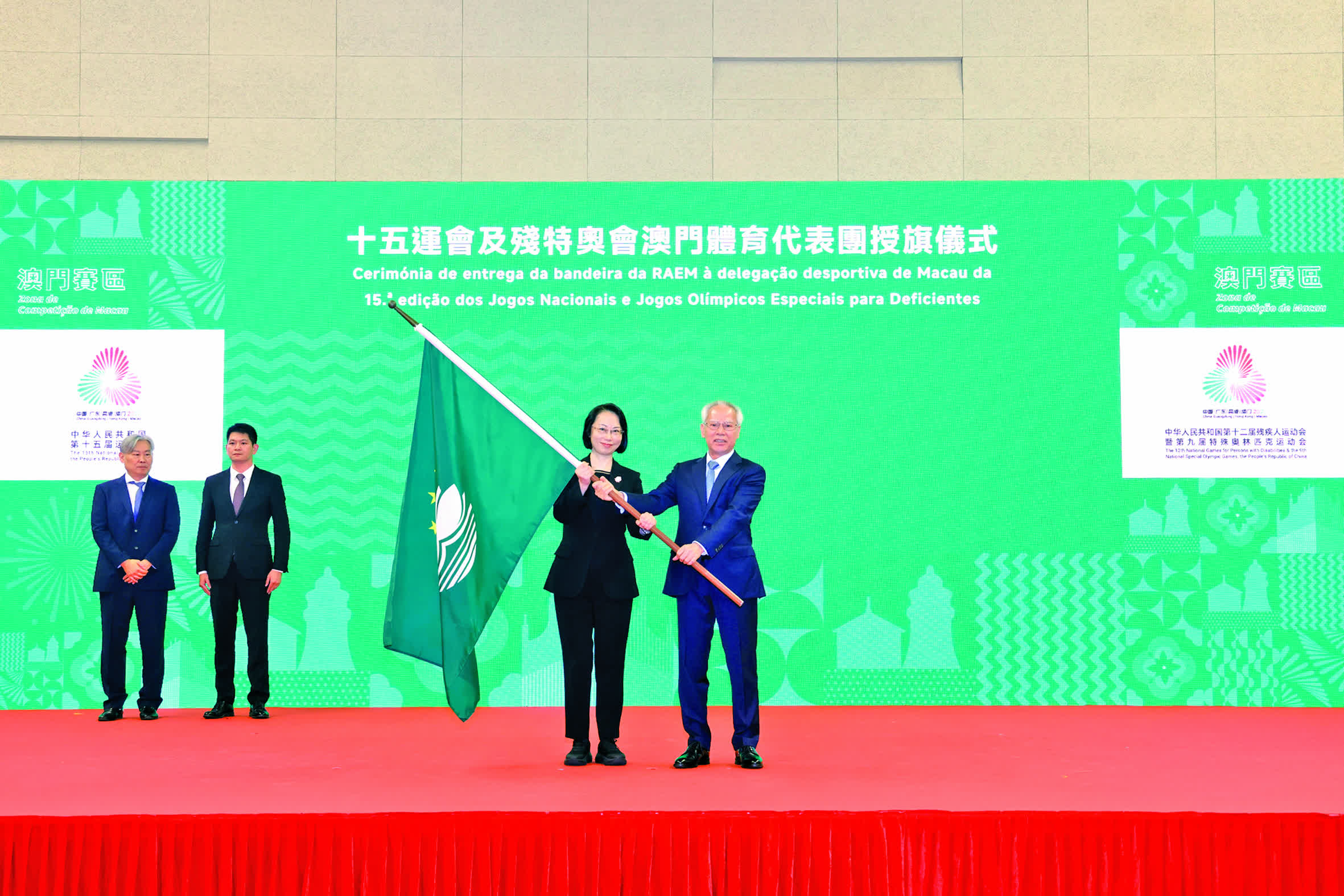 第十五屆全國運動會和全國第十二屆殘疾人運動會暨第九屆特殊奧林匹克運動會將於本年11月及12月舉行,首次由粵港澳三地共同承辦。為激勵澳門健兒爭創佳績,並凝聚志願者力量展現東道主風采,澳門特區日前舉行澳門體育代表團授旗儀式,以及志願者誓師大會。