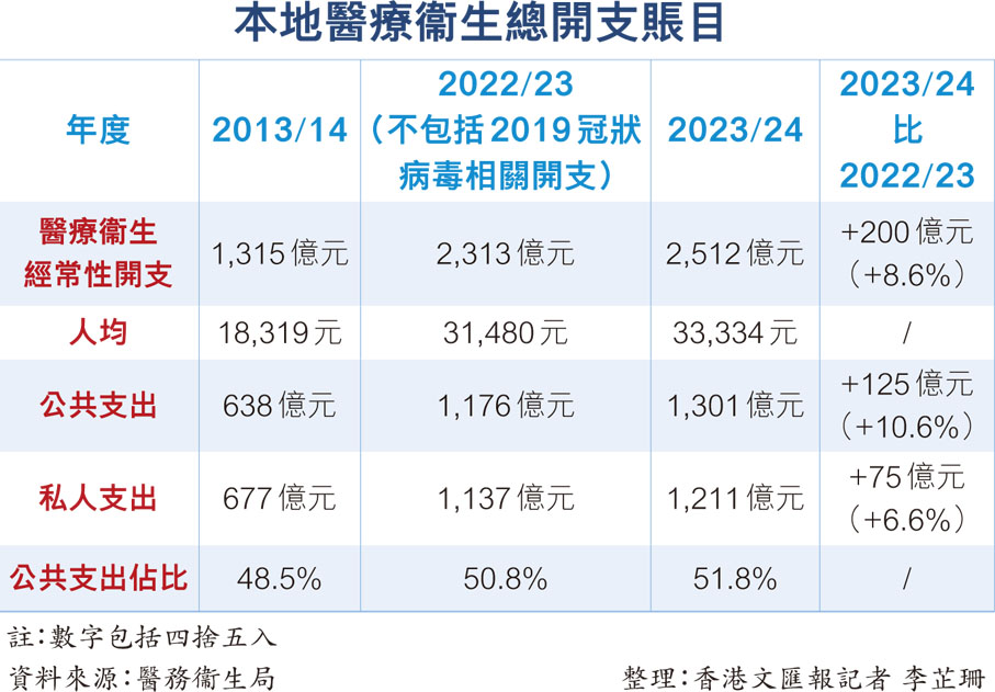 【識港網訊】在香港人口老齡化情況下,公共醫療開支顯著增加。特區政府醫務衞生局昨日發表2023/24年度《本地醫療衞生總開支賬目》,該年度醫療衞生經常性開支高達2,512.07億元,較上一個年度(不包括2019冠狀病毒病相關開支)增加約200億元,升幅8.6%,近52%用於公共醫療系統,十年間升一倍;人均醫療衞生經常性開支為33,334元。隨着長者人口由164萬增至2036年的244萬,令醫療體系面對嚴峻挑戰,公營醫療收費改革迫在眉睫,對於明年起公立醫院上調藥物收費及急症室等費用,醫衞局強調調整收費對增加收入作用不大,但額外收入會全數投入公營醫療系統中。