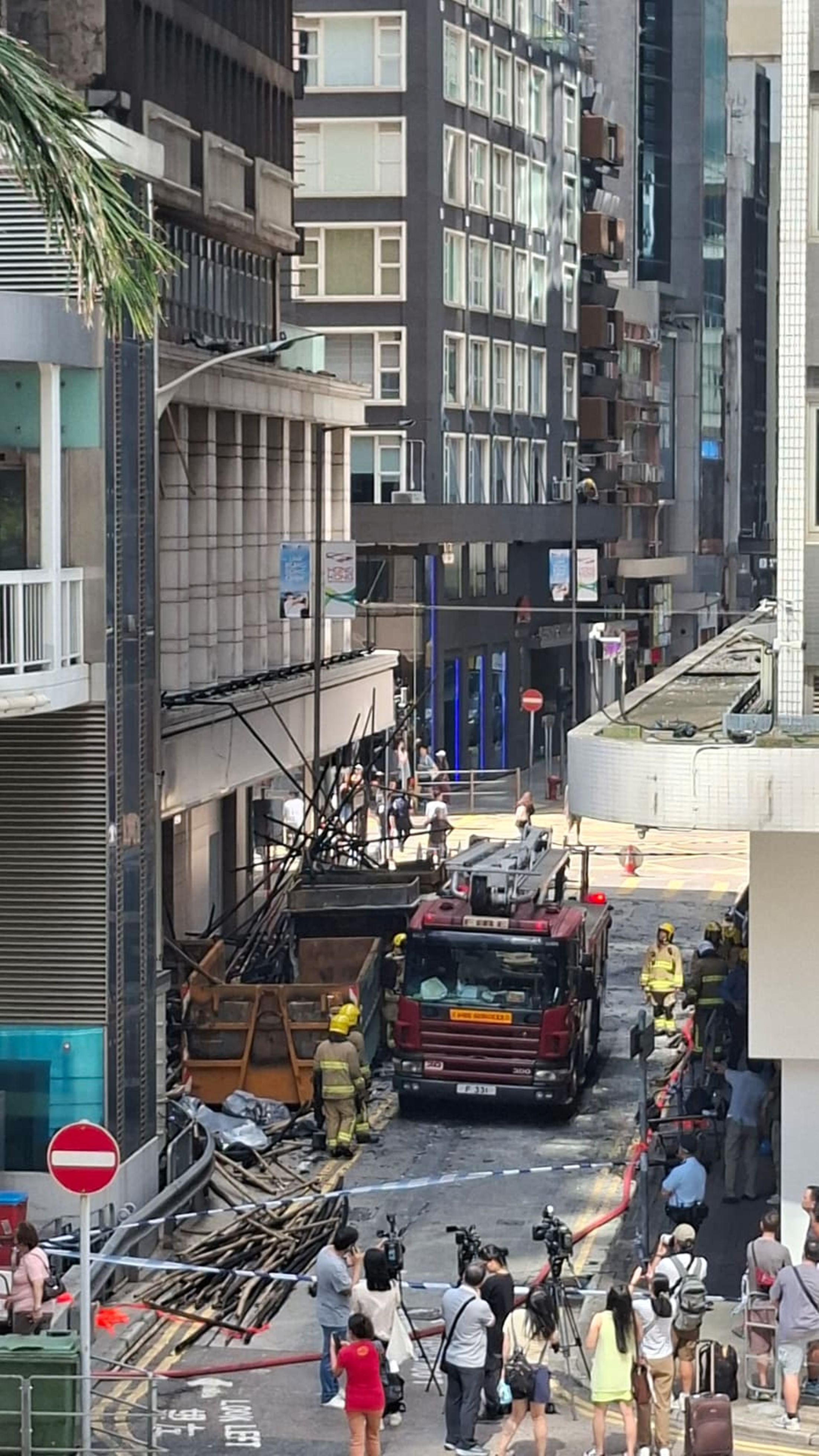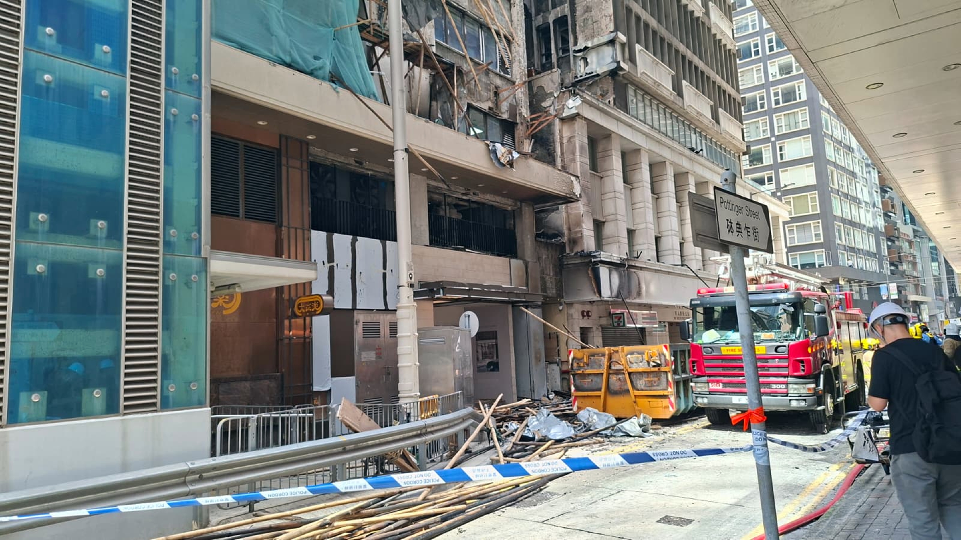 【識港網訊】中環干諾道中華懋大廈18日發生三級火,外牆多層大片棚架被焚,造成4人受傷送院,當中2人情況危殆。記者今日(19日)上午重返現場了解情況,可見現場仍然未解圍,涉事大廈外牆嚴重熏黑,冷氣機被焚,有牆身出現剝落情況,燒焦的棚架竹枝碎片散落一地,多層仍有部分竹枝搖搖欲墜,毗鄰大廈外牆亦有金屬組件被燒溶,屋宇署人員到場視察損毀情況,消防員升起雲梯查看外牆。消防處成立的專隊正調查起火及火勢蔓延迅速的原因。