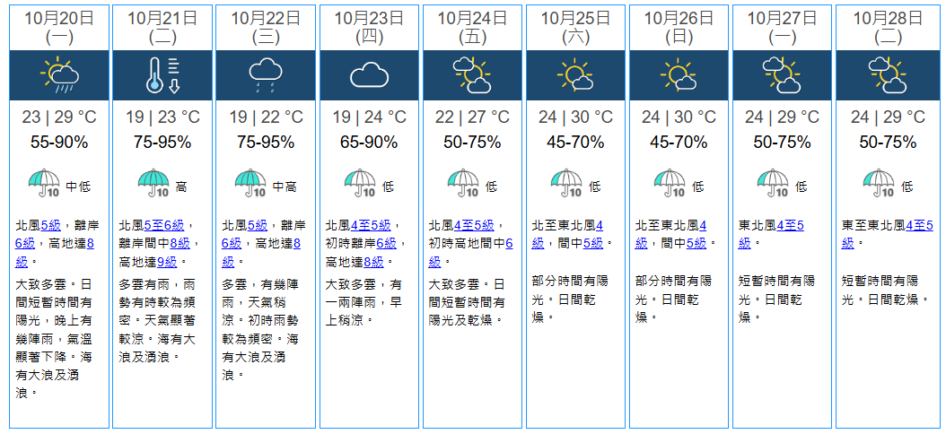 天文台又指,一股強烈東北季候風會為未來數日持續影響華南。預計本港未來數日風勢持續頗大,漸轉多雲有雨,星期二及星期三初時雨勢較為頻密。星期二至星期四市區氣溫顯著下降至19度左右,新界再低兩三度。海有大浪及湧浪,晚上部分沿岸低窪地區可能出現水浸。根據自動分區天氣預報顯示,在星期二及星期三,上水、大埔、沙田、將軍澳、流浮山及屯門低見17度,而打鼓嶺及石崗更降溫至15度。