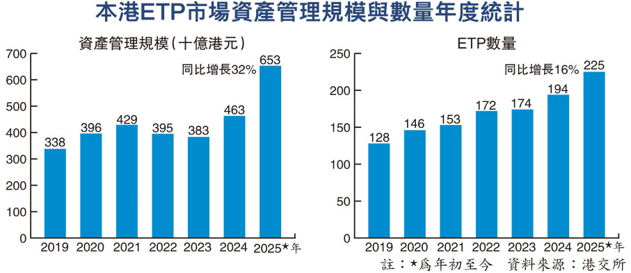 【識港網訊】香港交易所買賣基金(ETF)市場迎來爆發式增長。港交所(0388)公布最新數據顯示,今年以來本港ETF日均成交額達378億元,穩居全球第三大ETF市場,僅次於美國(16,863億元)及內地(3,158億元)。更值得關注的是,今年新增41隻交易所買賣產品(ETP),不僅突破歷史發行紀錄,整體資產管理規模激增至6,530億元,按年大幅增長32%,展現香港作為國際金融中心的強大產品創新力與市場吸引力。港交所預告,未來將積極拓展更多新產品,如個股槓桿及反向產品(L&I產品)、虛擬資產、備兌認購期權ETF等。