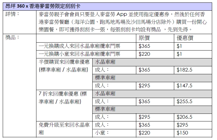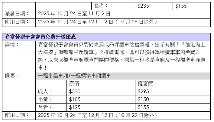 此外,由10月24日至12月12日,麥當勞親子會會員在東涌或昂坪纜車站售票處,出示有關「維港海上大巡遊」主題纜車的推廣電郵,即可獲得單程纜車車廂免費升級,以來回標準車廂纜車門票的價格,乘搭一程水晶車廂及一程標準車廂纜車。