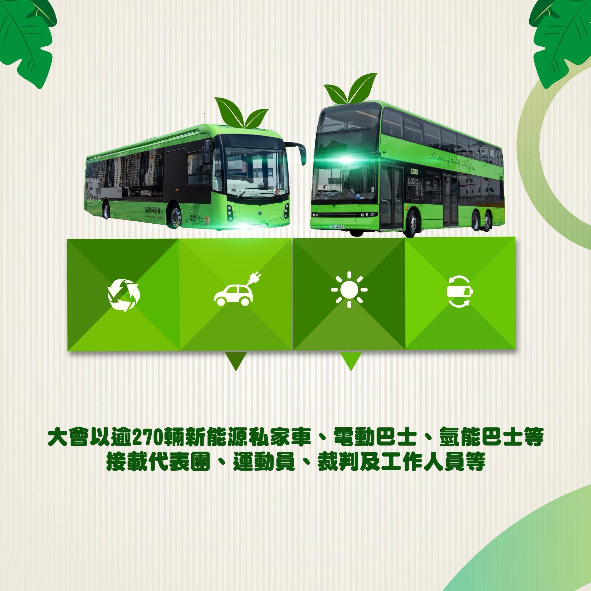 環境及生態局表示,大會以逾270輛新能源私家車、電動巴士、氫能巴士等,接載代表圑、運動員、裁判及工作人員等,亦會發布公眾指引,協助觀眾善用公共交通系統前往場館觀賽。
