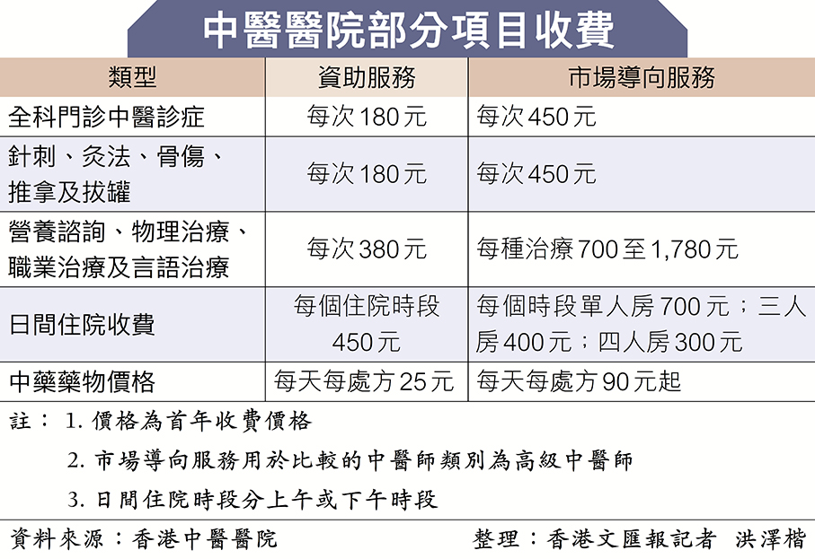 在收費方面,政府資助服務佔65%,供合資格市民選用,全科門診診金每次180元,每處方一日藥收費25元,日間住院服務首年收費450元,護理服務等介乎200元至800元。至於市場導向服務,採用三種收費模式,包括「套餐收費」,按治療目的及安排,以固定價格涵蓋整個治療收費;「簡易分項收費」,按服務複雜程度分層,同級服務劃一收費;「組合式收費」,每項治療只收取一次綜合費用,無須另付細項服務費。