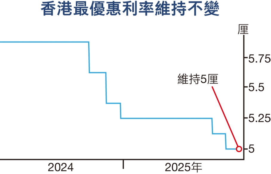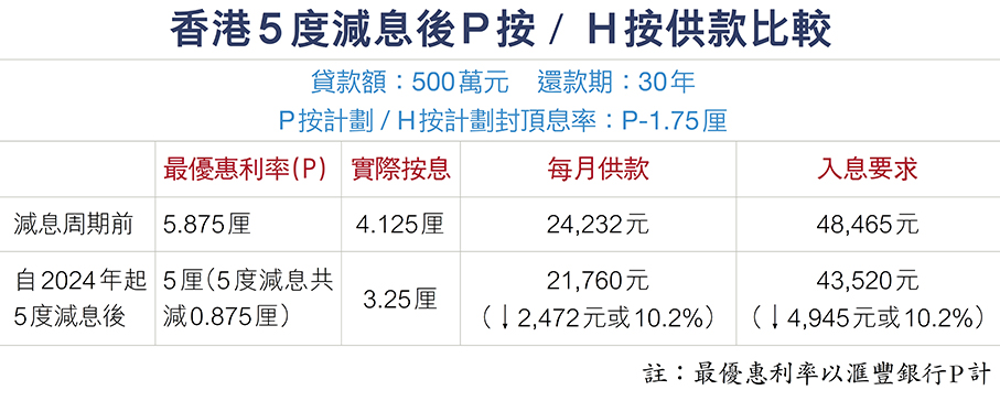 在美國宣布減息後,昨日滙豐、中銀、恒生及渣打等本港銀行維持最優惠利率(P)不變。經絡按揭轉介營運總監張顥曦表示,現時港P已回復至加息周期前的水平,理論上本港銀行沒有減息的空間。總結2024年至2025年本港減息周期,本港銀行累計減息5次,合共0.875厘,P按息率及H按封頂息率亦由減息周期前的4.125厘,下調0.875厘至現時3.25厘。假設業主的物業貸款額為500萬元、年期30年,經過銀行5次減息後,現時實際按息已下調至3.25厘,每月供款減少2,472元或10.2%至21,760元。