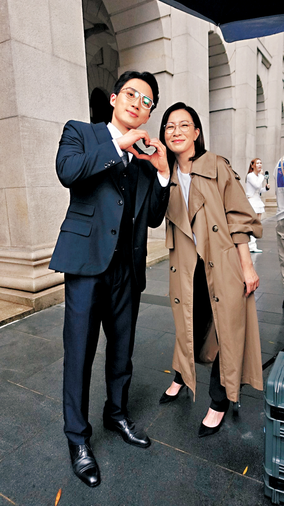 近日天氣炎熱,身穿三件頭西裝的周嘉洛,認為最重要是保持心靜就會自然涼,阿佘亦很認同,又直言有時天氣太熱也令人很忟不想說話。至於要穿上冷衫加西裝拍攝的馬貫東則早有準備,帶備3把風扇去開工,他表示會將其中一把風扇放於外套內降溫;穿上樽領衫拍攝的蔣祖曼,不用埋位時亦用風扇降溫,問她在炎熱天氣着冬裝開工是否很辛苦?她說:「最重要保持冷靜,夏天真係控制唔到,一開始流汗就停唔到,所以唔可以畀自己有咁嘅感覺。」