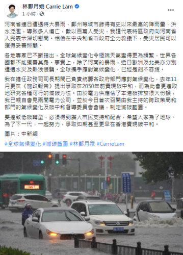 她指出,各地專家已不斷指出,全球氣候變化令極端天氣變得更為頻繁,世界各國都不能獨善其身。事實上,除了河南的暴雨,近日歐洲及北美亦分別遭遇水災及熱浪侵襲。全球攜手應對氣候變化,已經是刻不容緩。