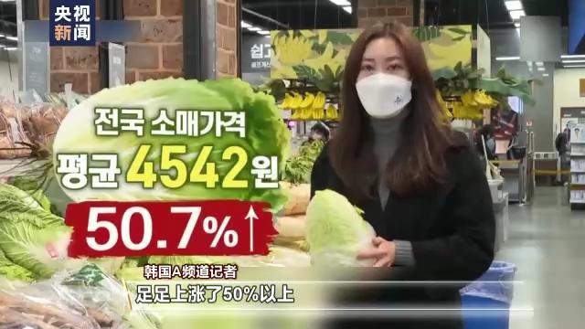 韓國A頻道記者:一棵白菜全國平均零售均價為4542韓圜(約24.5元人民幣),考慮到去年不過3000韓圜多一點,足足上漲了50%以上。