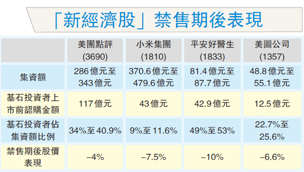 以美圖為例,該股上市以來壞消息不絕,首半年已從高位大幅回落63%。不過,由於部分股份被禁售期鎖死,該股仍能穩守招股價,惟禁售期屆滿後即被大手沽貨套現,一插到底。美圖由上市至今,股價累跌三分之二。