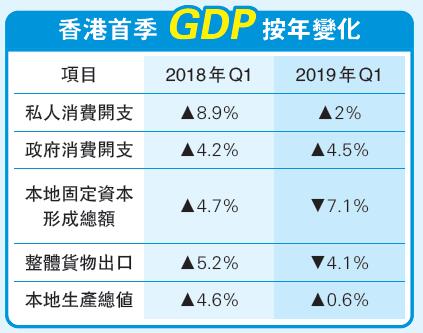 港府將首季經濟增長由早前公布的0.5%輕微上調0.1個百分點至0.6%,仍較去年第四季的1.2%放緩0.6個百分點。政府經濟顧問歐錫熊昨表示,若中美無法達成貿易協議,香港經濟將有明顯下行壓力。
