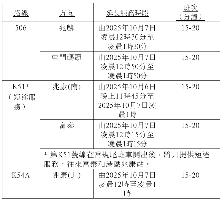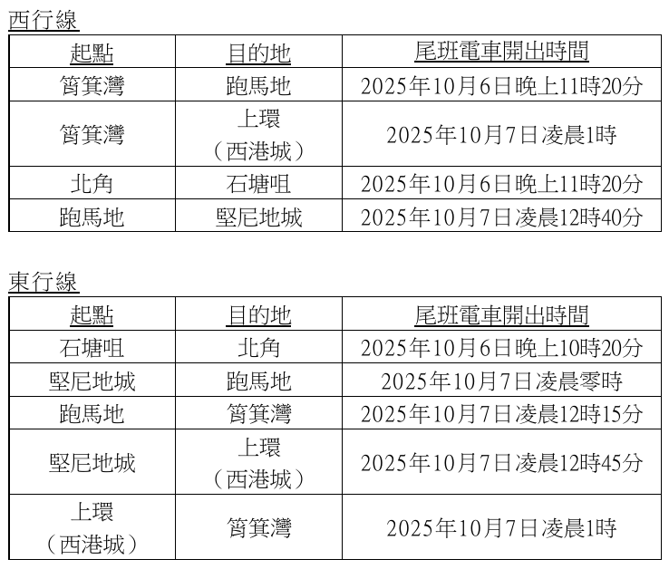 10月6日港鐵/輕鐵通宵服務各線路班次