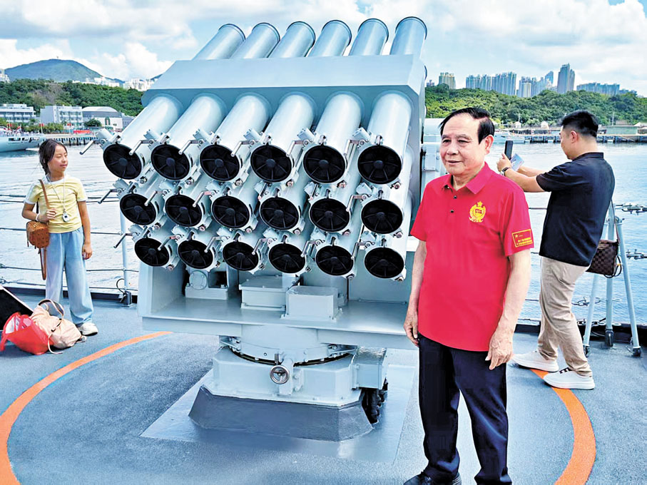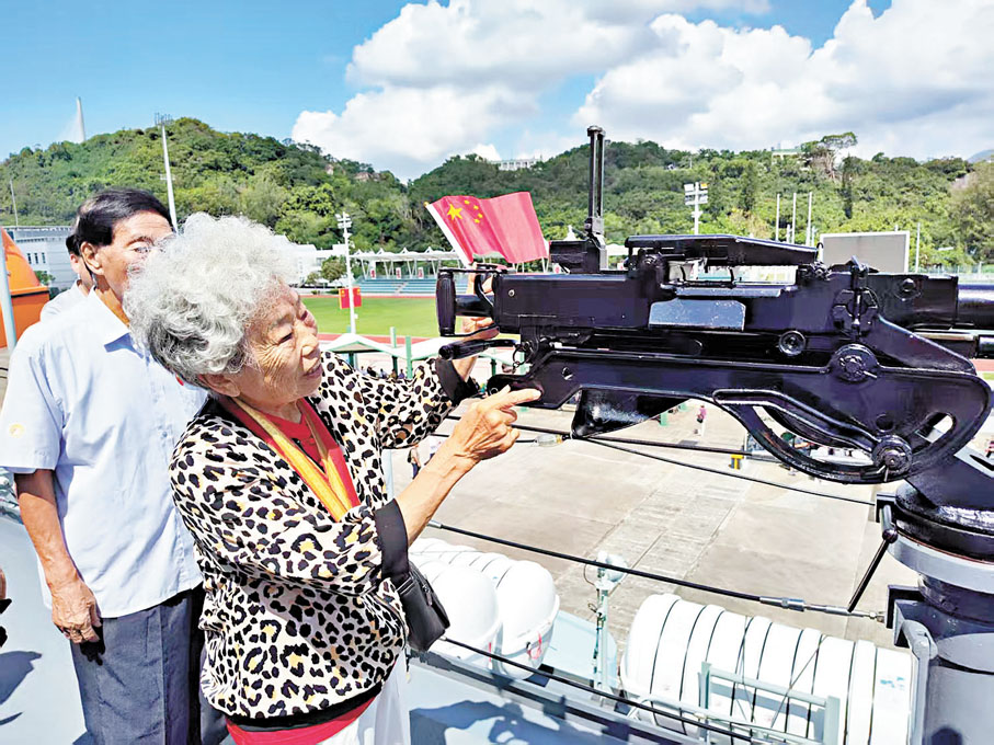【識港網訊】由中國人民解放軍海軍戚繼光艦、沂蒙山艦組成的海軍83艦編隊,今日(3日)離開香港。原東江縱隊港九獨立大隊老游擊戰士聯誼會會長、現年90歲的東江縱隊老戰士林珍一行十多人,昨日先後登上戚繼光艦及沂蒙山艦,親身感受祖國的軍事力量發展。海軍官兵向林珍介紹兩艘軍艦上配備的軍備武器,林珍近距離接觸艦上的機關槍後感嘆道:「太棒了,當年港九大隊只有木船,根本沒有這麼厲害的攻擊武器。這就是強軍有保障、有實力,是我們的底氣,真厲害!」她說,是次參觀也是一次受教育的過程,國家的強大離不開黨的領導和統一指揮,「所以我們會堅定地跟隨黨的步伐走下去。」