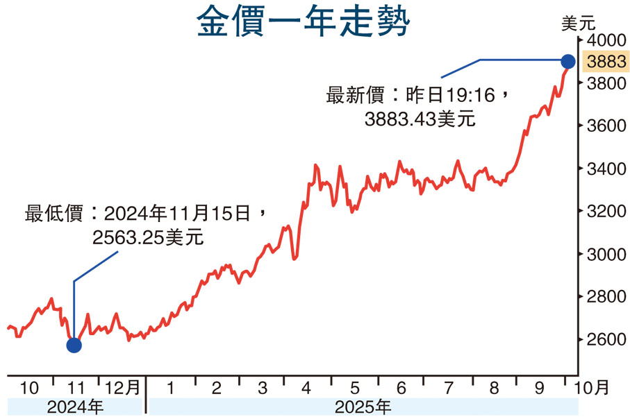 【識港網訊】美國聯邦政府停擺刺激金價屢創新高,香港時間周三早間,現貨金價曾升至每盎司近3,900美元,連續第5日上升;紐約期金曾升穿3,900美元,高見3,922.7美元。年初至今金價已飆升近50%,高盛發報告稱,金價還有上漲空間,甚至可能高於其此前的預估。