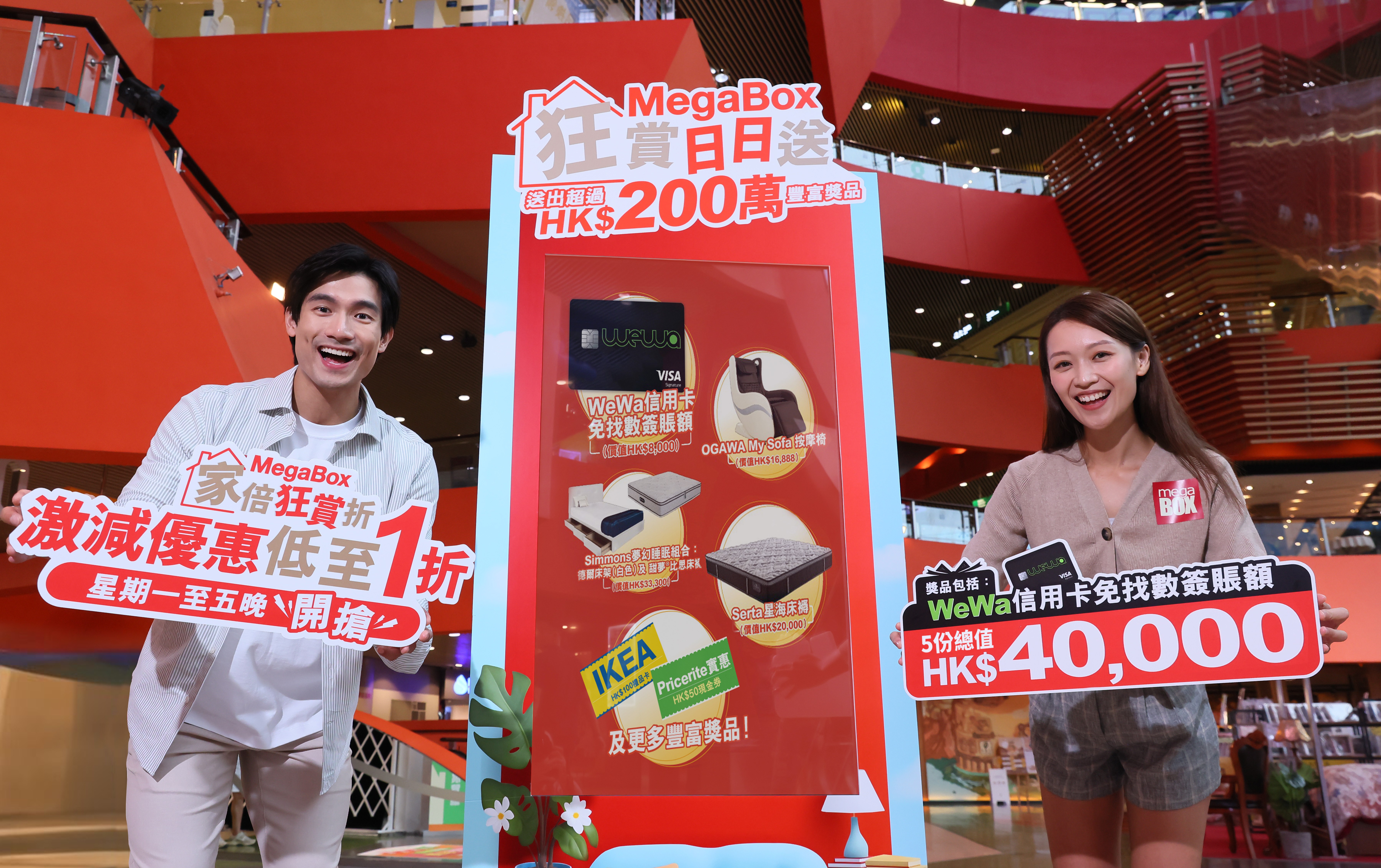 MegaBox於9月30日至11月2日推出「狂賞日日送」活動,送出總值超過200萬港元的禮品,包括信用卡免找數簽賬額(全期送出5份總值4萬港元)、名貴傢俬及電器產品、購物禮券等。