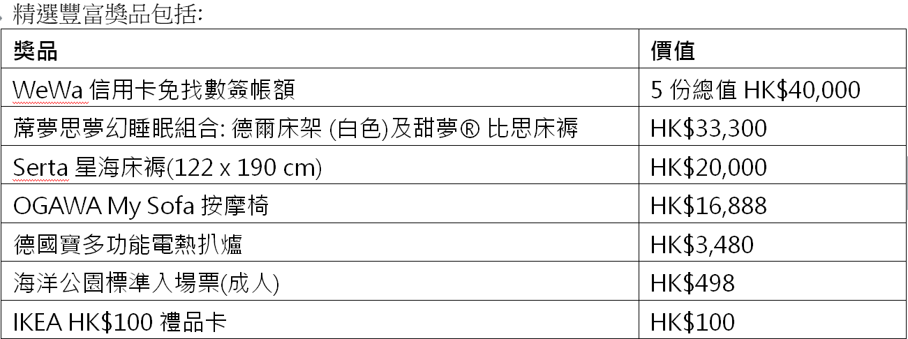 參加辦法:顧客於MegaBox以即日電子貨幣消費滿1,000港元即可參加即抽即獎活動一次,獎品如下:
