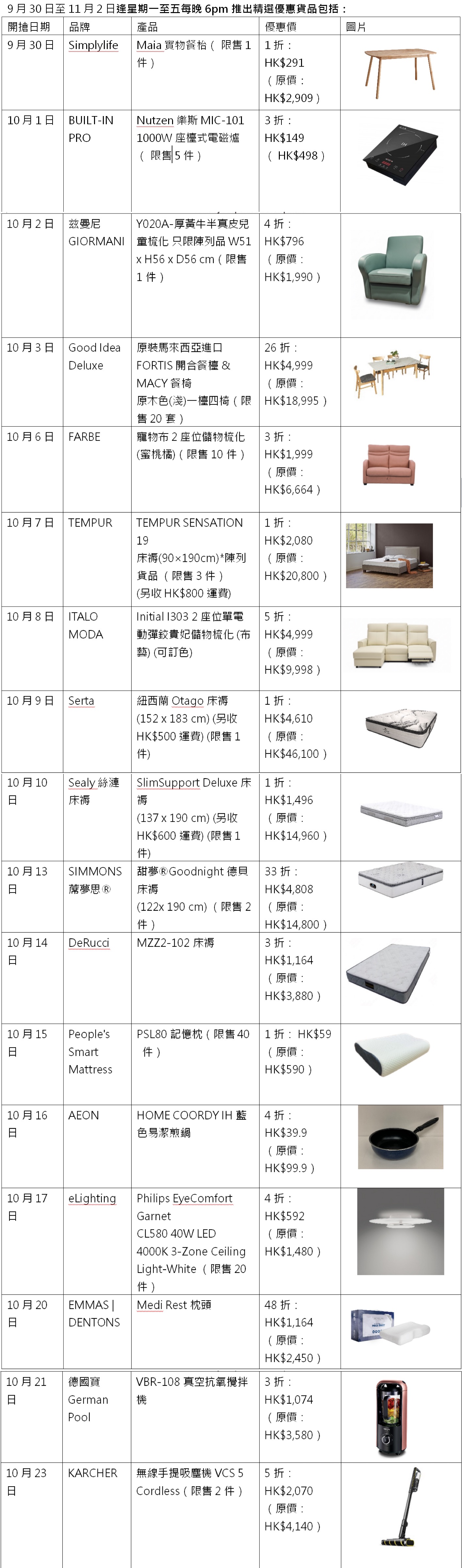 9月30日至11月2日逢星期一至星期五每晚6時,更有精選貨品低至1折發售,涵蓋傢俬、家品、電器及生活用品等,為顧客提供升級家居的絕佳機會。精選優惠貨品如下: