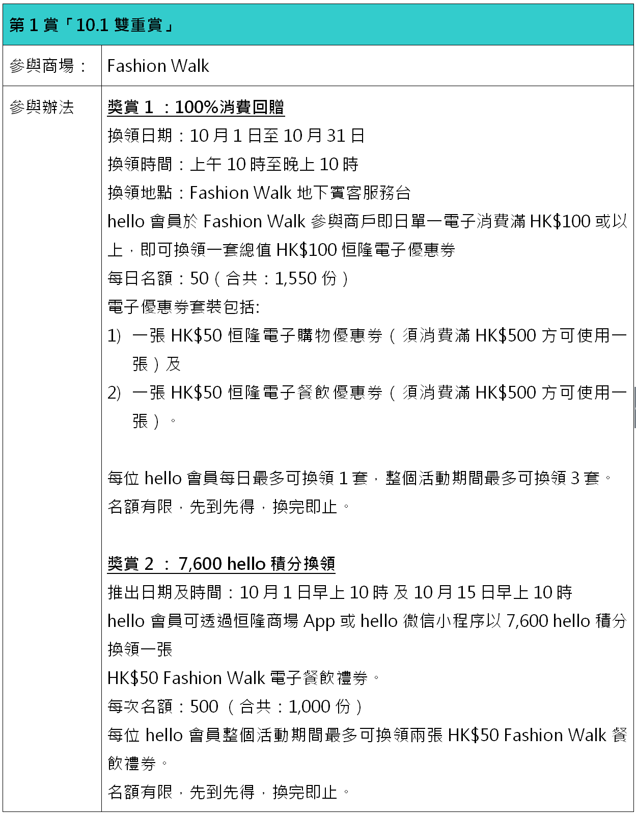 第1賞:10月1日起消費HK$100 即賞HK$100電子優惠券 回贈率高達100%