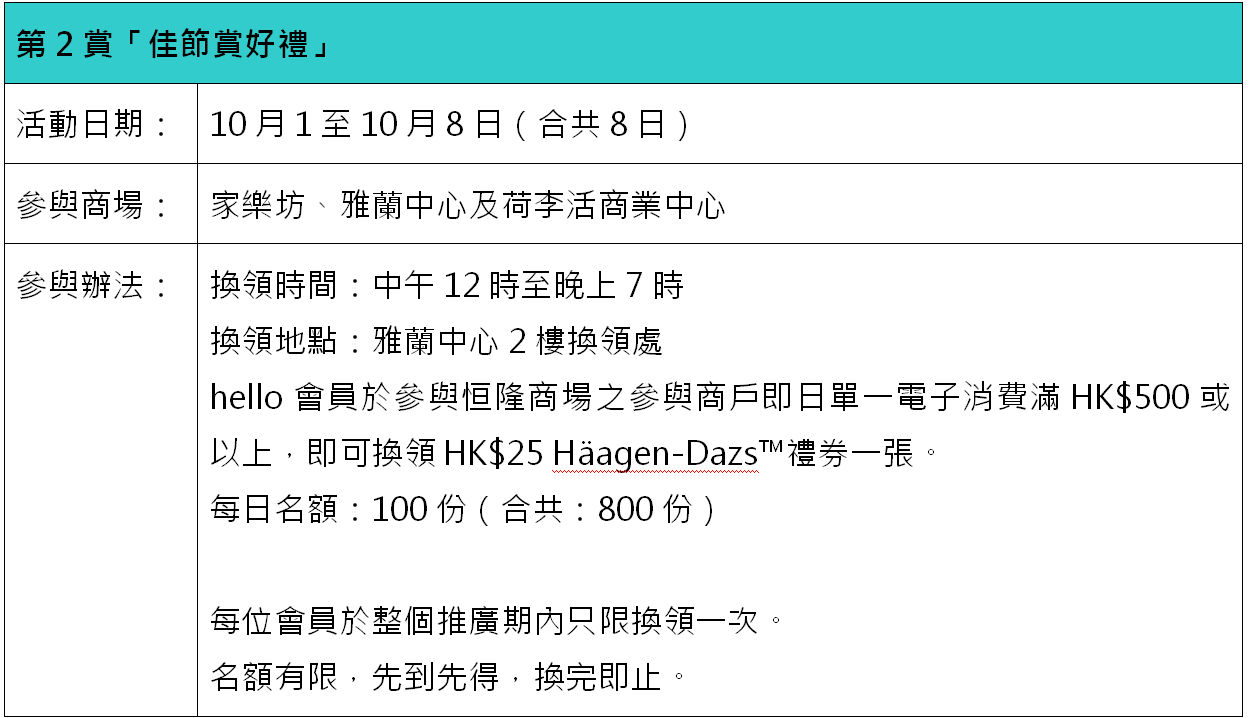 10日1日至10月8日期間,hello會員於家樂坊、雅蘭中心及荷李活商業中心的參與商戶,即日單一電子消費滿HK$500或以上,即可換領HK$25哈根達斯禮券一張,每日名額100個。
