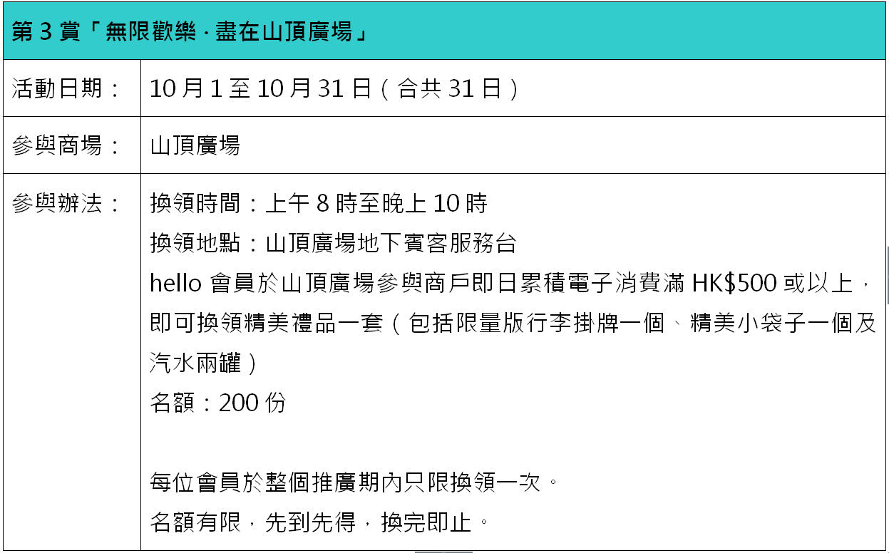 第3賞:山頂廣場消費滿HK$500 即送精美禮品包