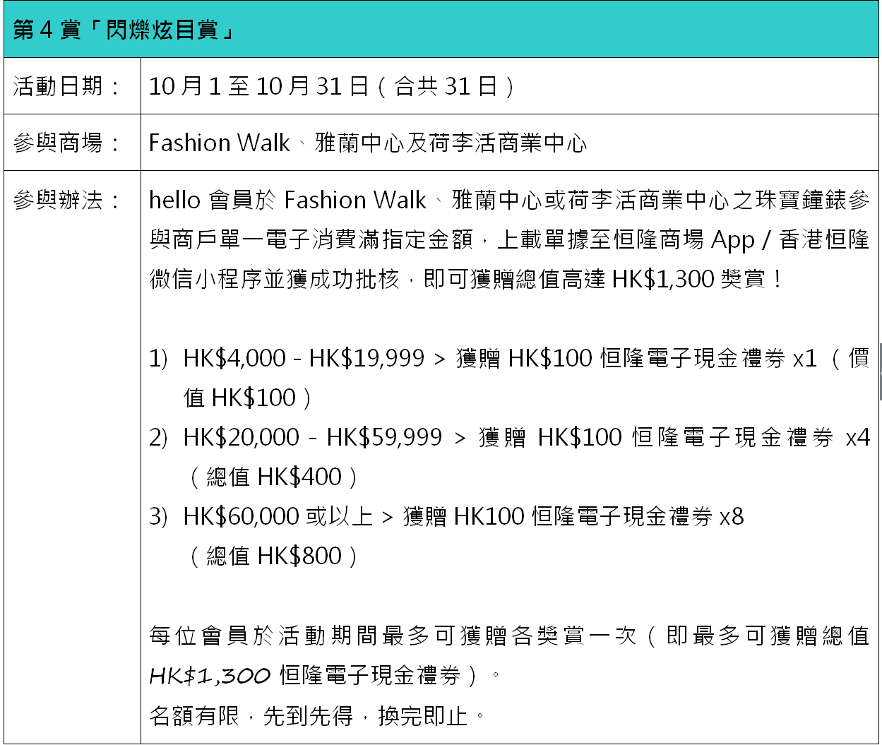 第4賞:「閃爍炫目賞」三大商場消費最高可獲$1,300獎賞