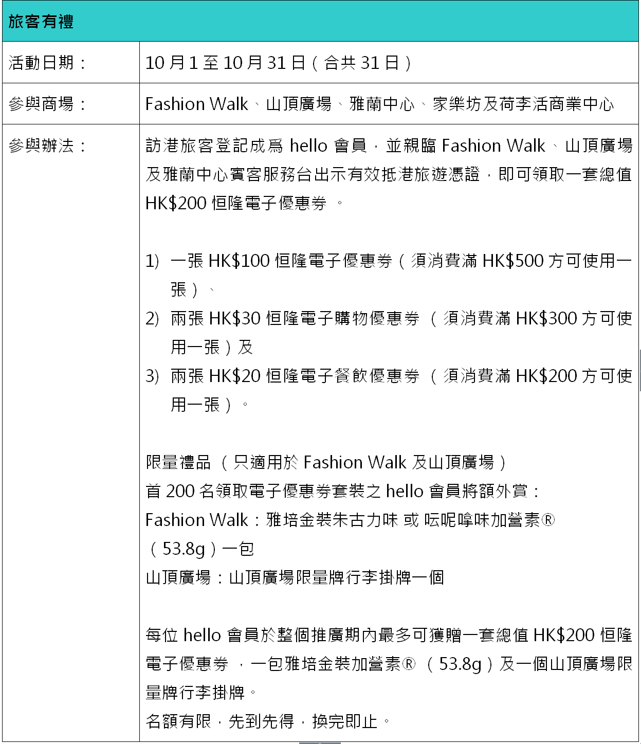 適逢國慶黃金周,Fashion Walk、山頂廣場、雅蘭中心、家樂坊及荷李活商業中心特別推出「旅客有禮」活動。10月期間,訪港旅客只要成為hello會員,並親臨Fashion Walk、山頂廣場及雅蘭中心的賓客服務台出示有效抵港旅遊憑證,即可換領一套總值HK$200恒隆電子優惠券。而首200名領取電子優惠券的hello會員將額外獲贈小禮品一份,萬勿錯過!