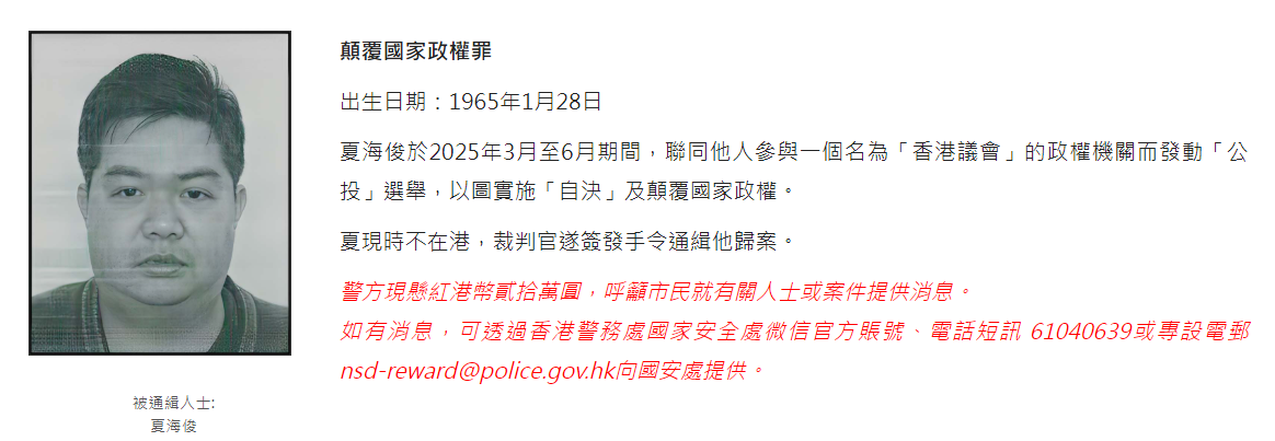 【識港網訊】據警方透露,國安逃犯夏海俊兄長今日(9日)早上被邀請到將軍澳警署協助調查。據悉,夏海俊於2025年3月至6月期間,聯同他人參與一個名為「香港議會」的非法組織而發動所謂「公投」選舉,以圖實施「自決」及顛覆國家政權。夏海俊現時不在港,法庭早前簽發手令通緝他歸案。