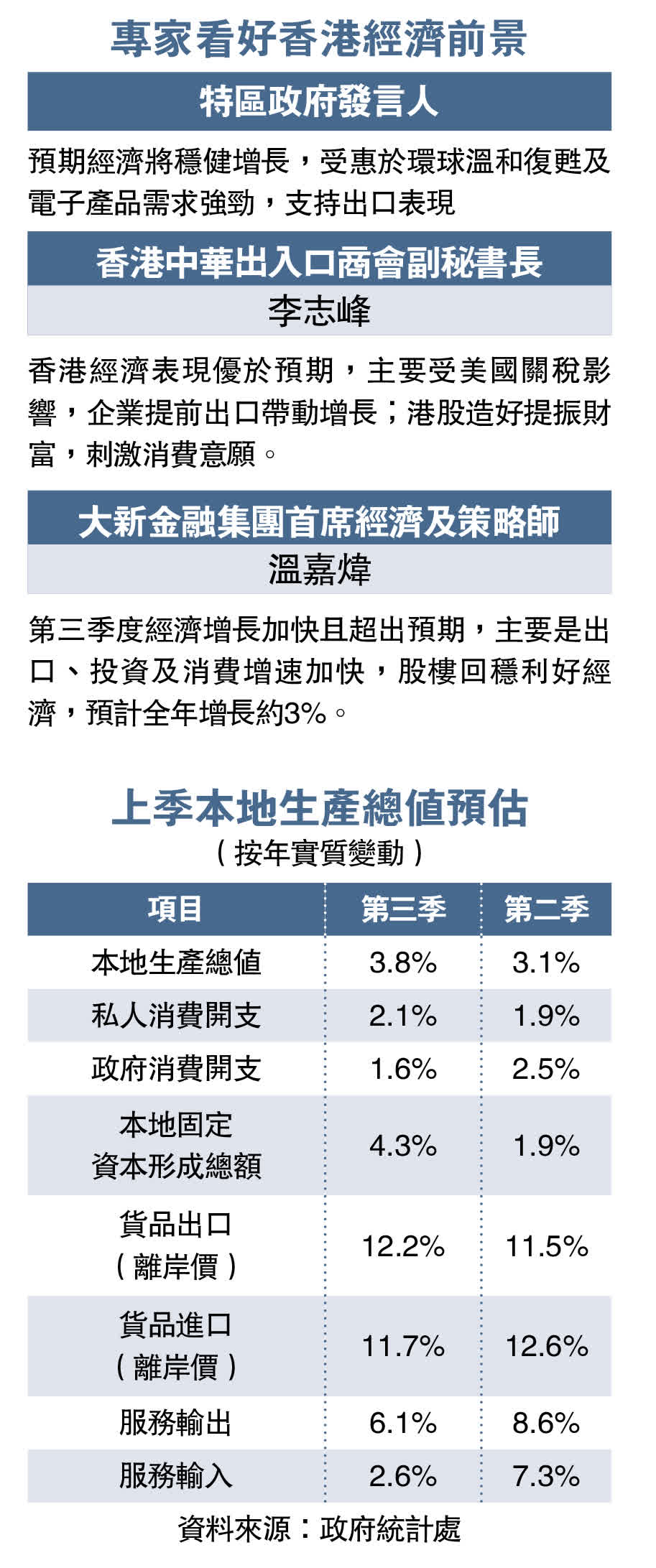 大新金融集團首席經濟及策略師溫嘉煒指出,第三季經濟增速加快並超出預期,主要受出口、固定資本形成及私人消費開支增速提升所推動。商業投資加快和樓市成交上升,是推動投資改善的主因,而股市暢旺及樓市回穩,亦有助提振消費氣氛。同時,貨物及服務貿易淨輸出,均為經濟增長帶來正面貢獻。