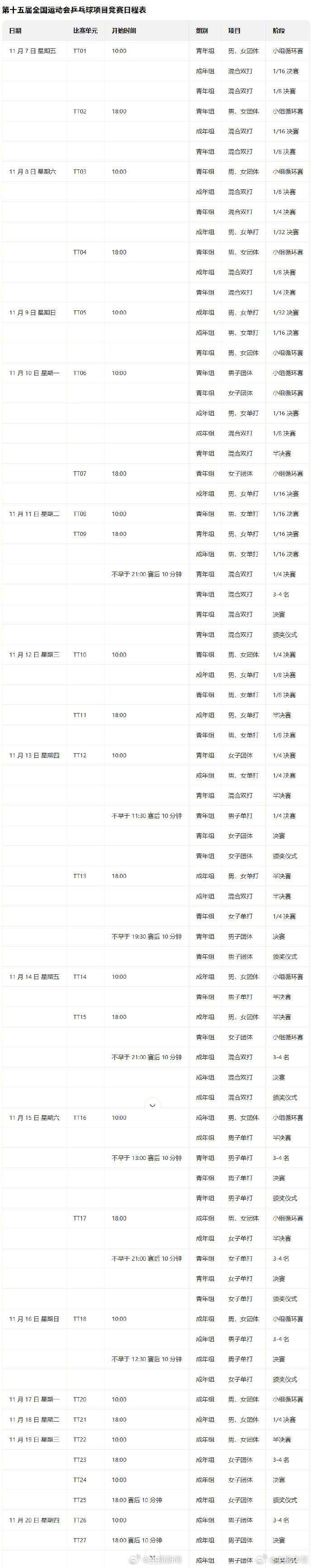 今年全運會的乒乓球比賽從11月7日開始,到11月20日結束,比賽將全部在澳門的銀河綜藝館進行,每個比賽日都是從上午10點開始。