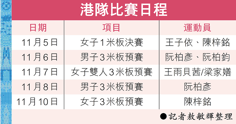 【識港網訊】十五運會跳水比賽如火如荼舉行,剛結束馬來西亞公開跳水錦標賽比賽的香港跳水隊,日前馬不停蹄趕到廣州出戰全運會,這也將是港隊歷史上首次參加全運會比賽。昨日下午,港隊教練率全體6名參賽選手,在十五運會跳水比賽場館廣東奧體中心跳水館進行適應性訓練。剛剛在馬來西亞公開跳水錦標賽奪得2銀2銅的好成績,港隊競技狀態不錯,全隊亦無緊要的傷病。主教練朱佳名表示,香港隊珍惜全運會頂級平台機會,全力以赴,目標是突破各個項目的港隊最好成績。