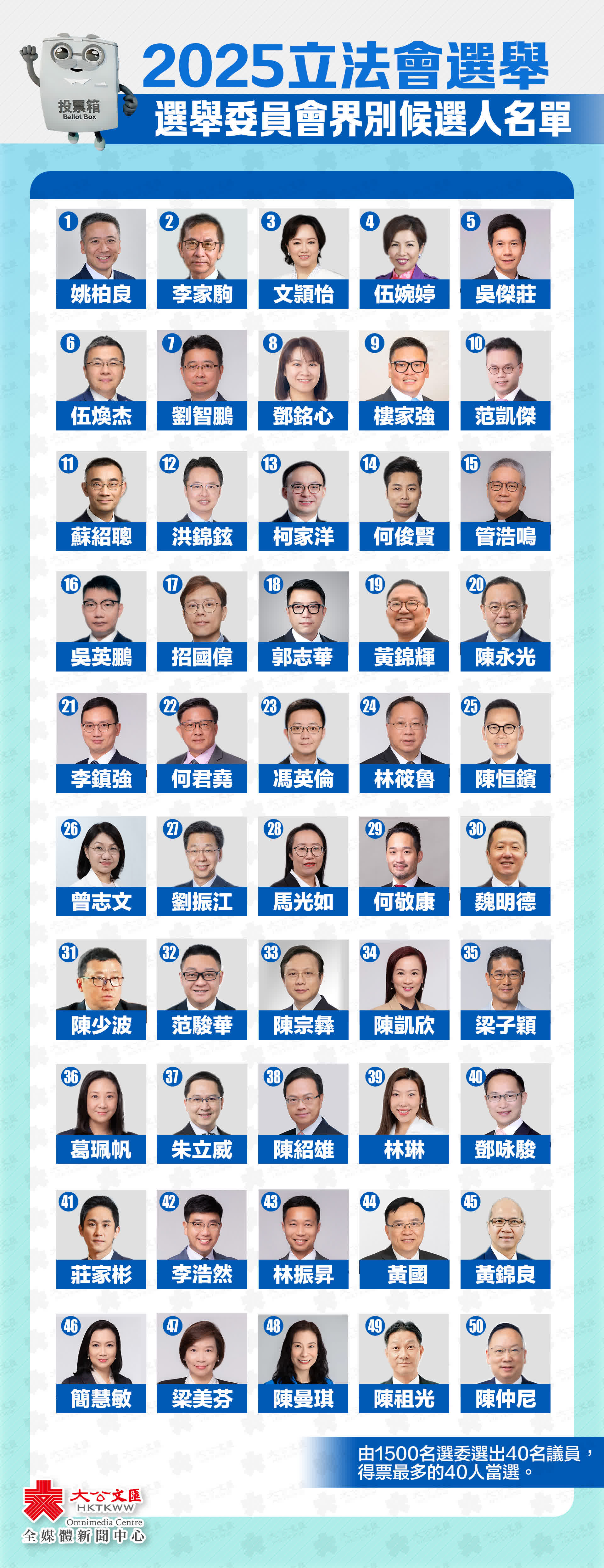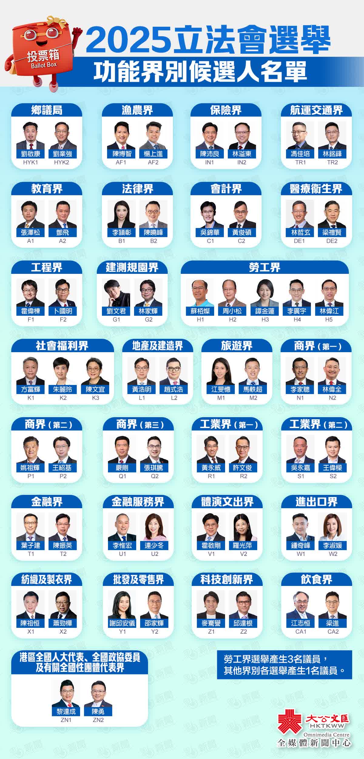 地區直選方面,該界別共載有近414萬選民,每名選民只需投選1名候選人,10個選區每區得票最多的2名候選人當選。10個地方選區,每區都有5到6人參選,競爭激烈,無人會自動當選。當中九龍中有6人爭2席,其他9個地方選區則是5人爭2席。功能界別選舉方面,60名候選人將競逐28個功能界別的議席,當中26個界別為兩人爭一席,社福界競爭最激烈,有3人參選,勞工界3個議席有5人報名參選。選委會界別選舉方面,共有50名候選人競逐40個議席,候選人涵蓋各個專業領域翹楚,包括資深法律界人士、教育工作者、科技創新領軍人物、金融服務專家、醫療衞生專業人員以及勞工界代表等。大公文匯全媒體為讀者整理了地區直選、功能界別及選委會界別的候選人名單及編號,助大家一圖睇清選舉戰況!