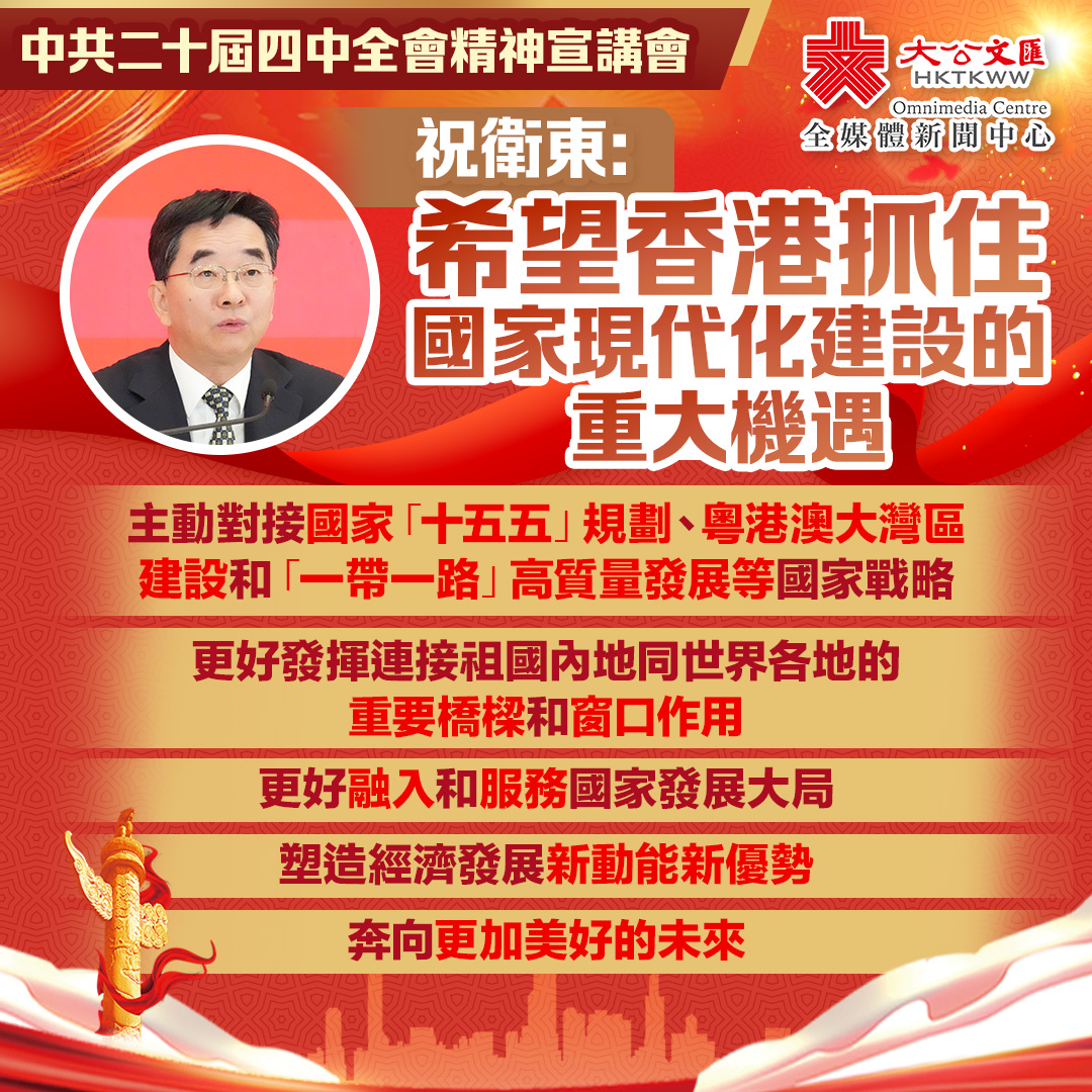 祝衛東表示,第八屆立法會選舉正在有序展開,迎來全力拚經濟、謀發展的最好時機,同時香港背靠祖國、聯通世界,有廣泛的國際聯繫。四中全會提出,促進香港、澳門長期繁榮穩定,內涵豐富,指向明確,充分體現中央對港澳發展一以貫之的關心、重視和支持,未來對港澳的政策支持力度會更大,範圍會更廣。希望香港抓住國家現代化建設的重大機遇,主動對接國家「十五五」規劃、粵港澳大灣區建設和「一帶一路」高質量發展等國家戰略,更好發揮連接祖國內地同世界各地的重要橋樑和窗口作用,更好融入和服務國家發展大局,塑造經濟發展新動能新優勢,奔向更加美好的未來。