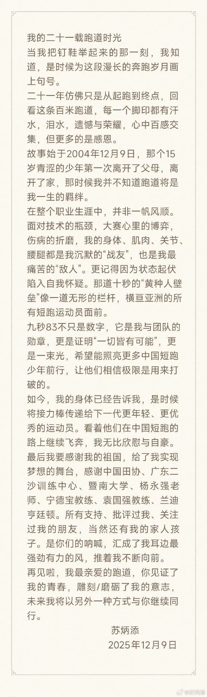 【識港網訊】今天(12月9日),男子100米亞洲紀錄保持者、中國短跑名將蘇炳添宣布退役。