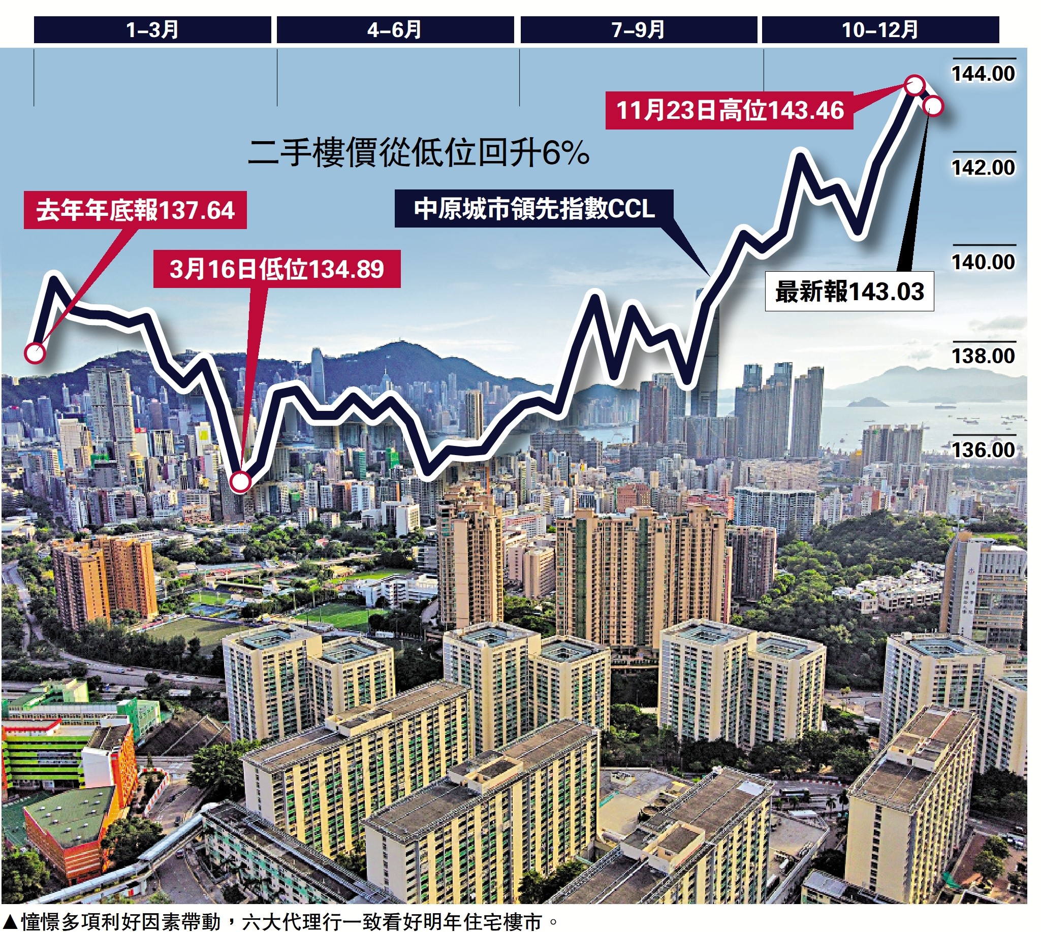 該行長線(6年)睇好,短線亦甚樂觀。中原地產亞太區副主席兼住宅部總裁陳永傑表示,CCL最新報143.03點,今年暫升3.92%,顯示樓價已觸底回升,預期全年錄約5%升幅。