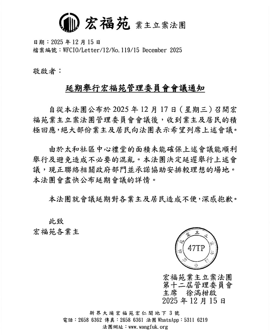 圖為延期舉行宏福苑管理委員會會議的通知。(網上圖片)