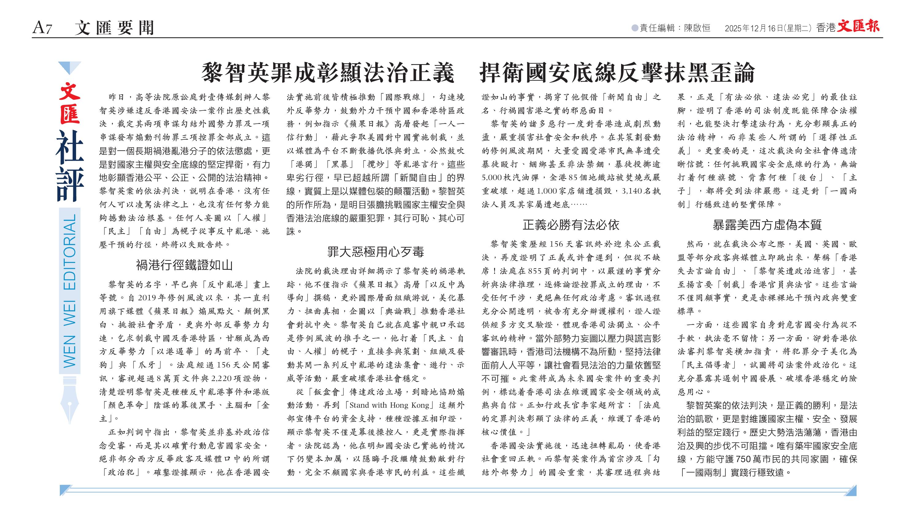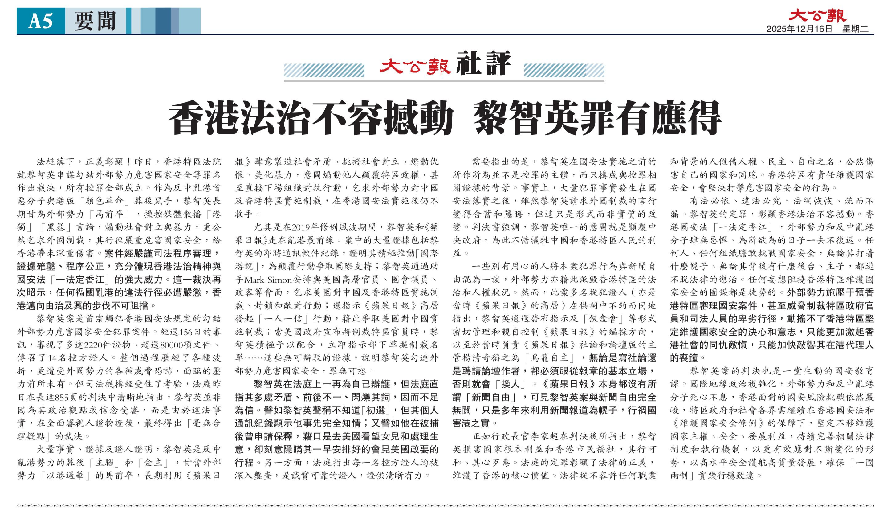 《大公報》發表社評指出,黎智英作為反中亂港首惡分子與港版「顏色革命」幕後黑手,長期甘為外部勢力「馬前卒」,操控媒體煽動社會與暴力,更公然乞求外國制裁,其行徑嚴重危害國家安全,給香港社會帶來深重傷害。案件經嚴謹司法程序審理,證據確鑿、程序公正,充分體現香港法治精神與香港國安法「一法定香江」的強大威力。