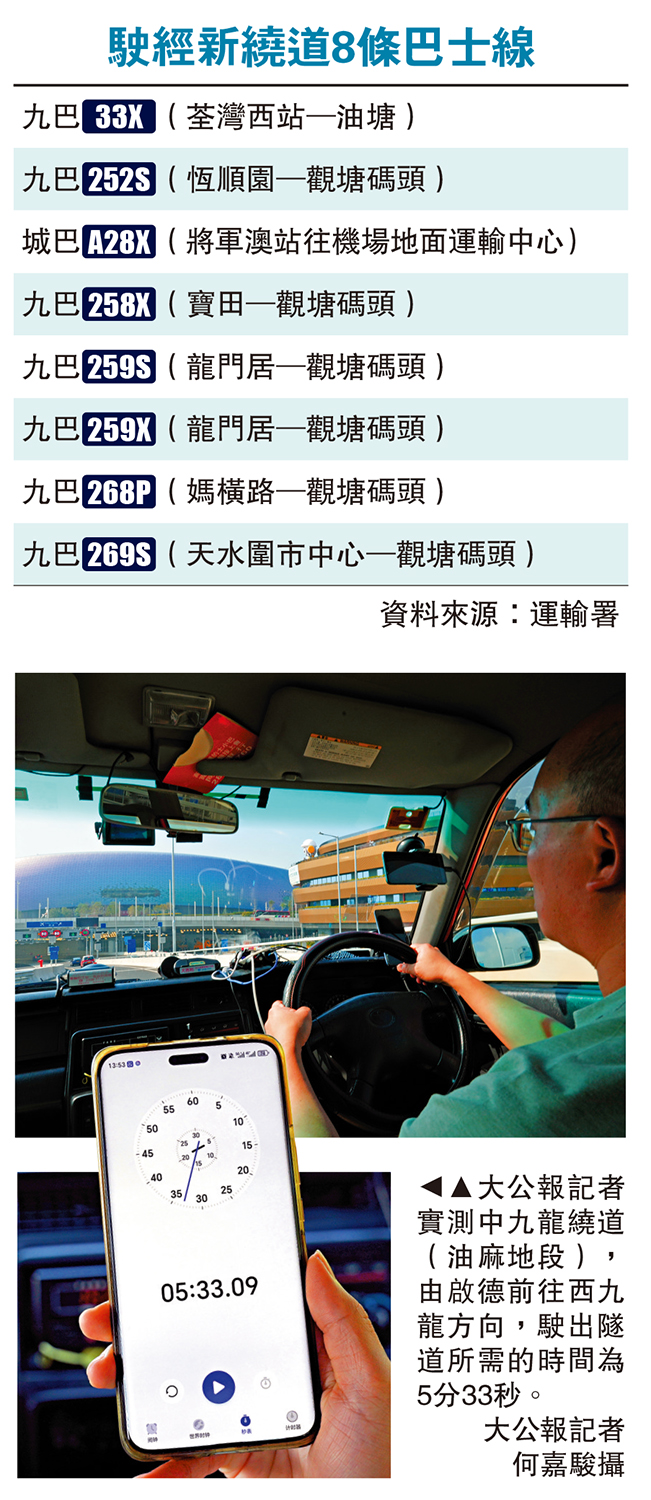 大公報記者乘坐的士實測經中九龍繞道(油麻地段),往返長沙灣政府合署與啟德體育園,單程僅需時約10分鐘,對比地圖導航推薦的舊路線,同樣由長沙灣政府合署出發,經加士居道,部分路段需等候交通燈,再經啟德隧道往啟德體育園,非繁忙時間全程約15分鐘,經新繞道可讓時間縮短近三分之一。