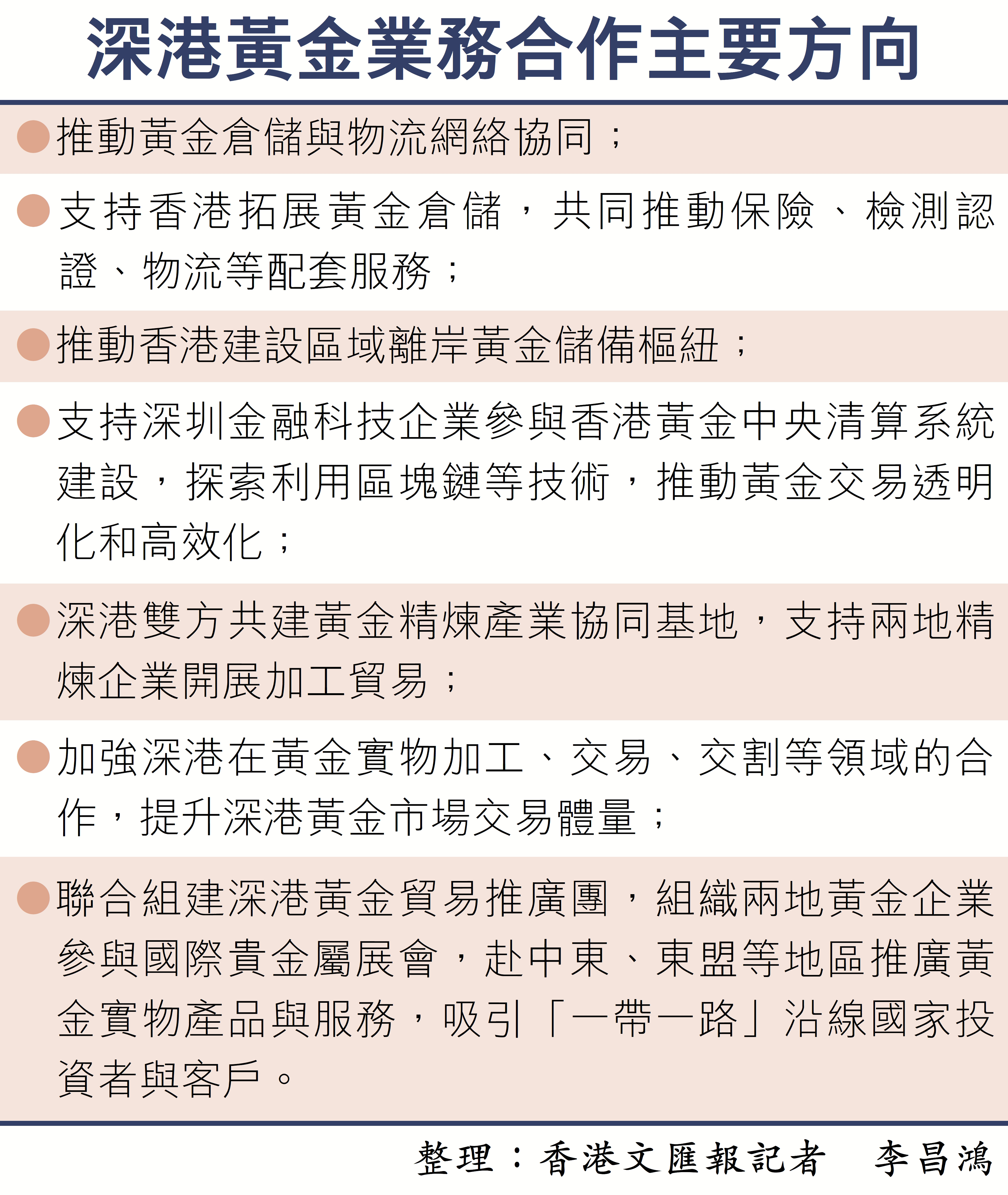 今年11月7日,香港與深圳在當日的深港金融合作委員會第三次會議上,特區政府財庫局與深圳市地方金融管理局簽署合作備忘錄,透過兩地優勢互補共同構建深度融合的區域黃金生態圈,依法依規支持香港金商與深圳具備相關資格的精煉企業開展加工貿易合作。