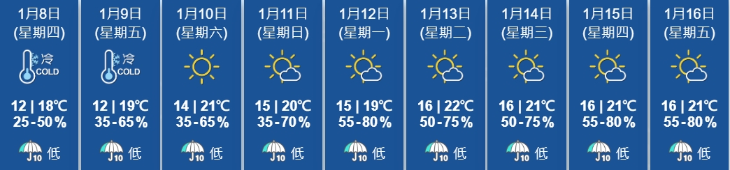天文台預測,受乾燥的冬季季候風持續影響,今明兩日廣東普遍晴朗,早上寒冷。隨着季候風在周末稍為緩和,華南氣溫略為回升,早上仍然清涼。預料一股偏東氣流會在下周初影響華南沿岸,該區風勢頗大。而乾燥的東北季候風會在下周中期為廣東沿岸帶來普遍晴朗的天氣。