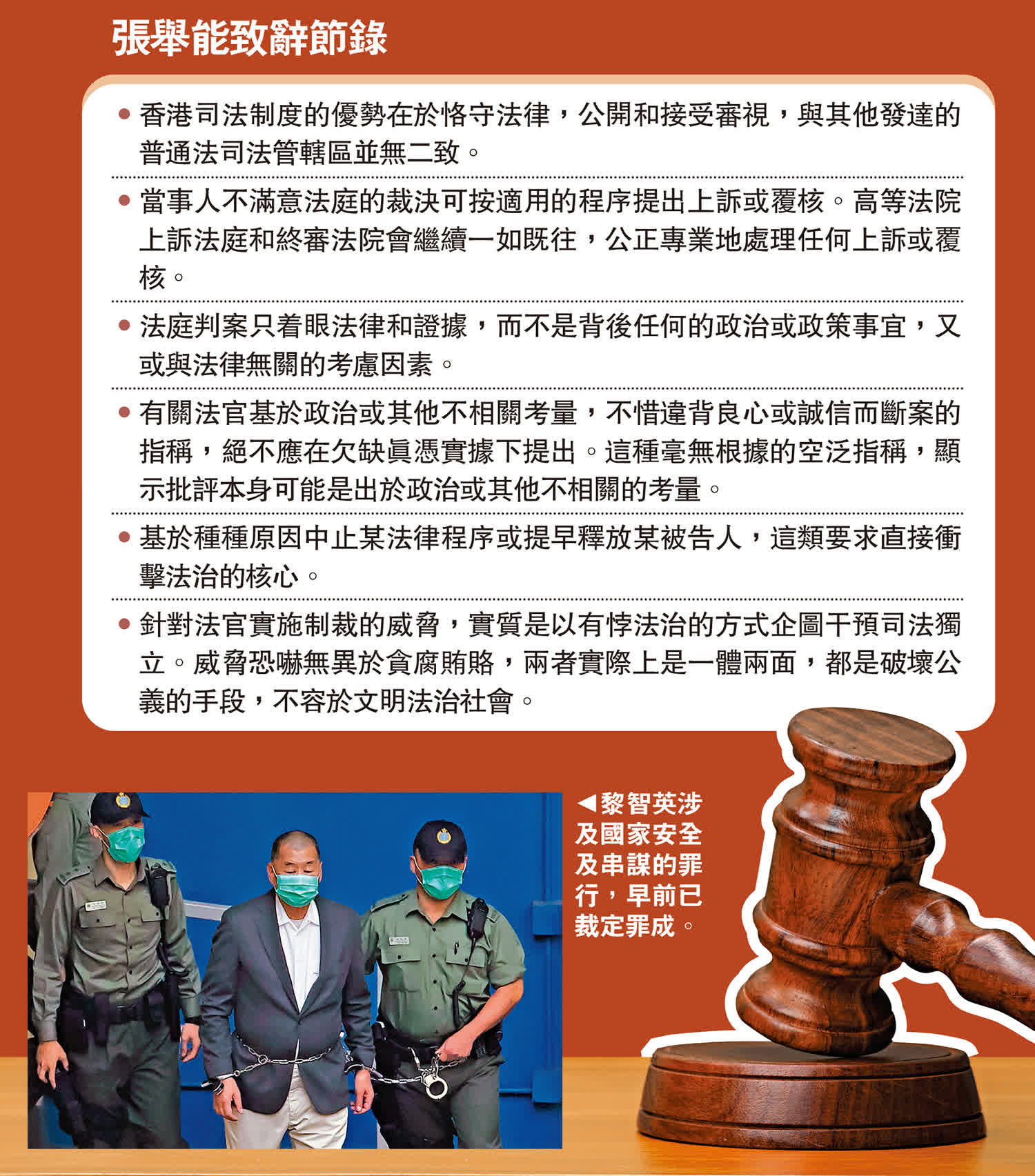 張舉能在致辭時談及黎智英案。他表示,黎智英及其公司被裁定涉及國家安全及串謀的罪行罪名成立,判刑部分仍未結束。如所預料,這宗備受注目的審訊的判決在國際上惹來不少關注和評論。鑒於目前地緣政治的角力,當中不乏對檢控和裁決,以至香港的法院和法治的情況的批評。張舉能強調,當事人不滿意法庭的裁決可按適用的程序提出上訴或覆核,高等法院上訴法庭和終審法院會繼續一如既往,公正專業地處理任何上訴或覆核。香港司法制度的優勢在於恪守法律,公開和接受審視。然而,任何評論或批評必須言之有據才有意義。因此,任何期望會被認真看待的嚴厲批評或相反意見,必須建基在細閱判案書及認真理解法庭論證之上。