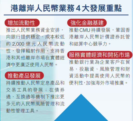 離岸人民幣業務方面,金管局指出,過去兩三年間,人民幣貿易融資增長超過50%,點心債增長逾60%。增長動力主要來自人民幣利率相對較低、匯率穩定,以及全球投資者分散投資的需求。余偉文表示,金管局將積極配合國家發展戰略,深化香港與內地金融合作,近期將從「增加流動性」、 「推動產品發展」、「強化金融基建」、及「服務實體經濟和開拓市場」等四大方面(見附表),致力鞏固提升香港離岸人民幣業務樞紐地位,促進金融機構和企業使用人民幣進行交易,並積極配合國家推進人民幣國際化。