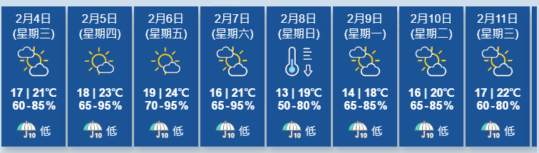 未來一兩日,天文台料天氣會較為潮濕,日間溫暖。周末期間風勢逐漸增強,氣溫顯著下降,周日及周一最低氣溫在13度左右。