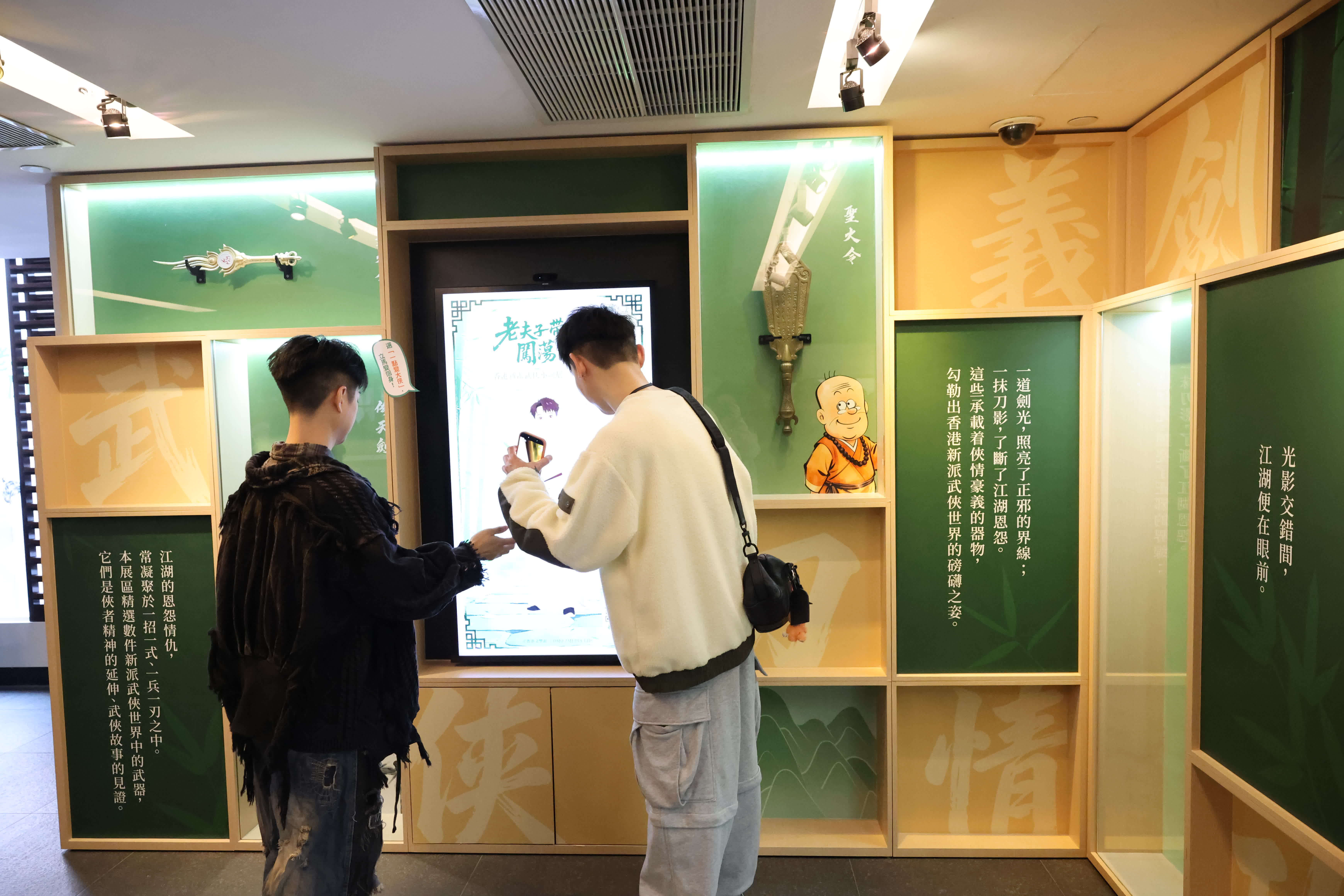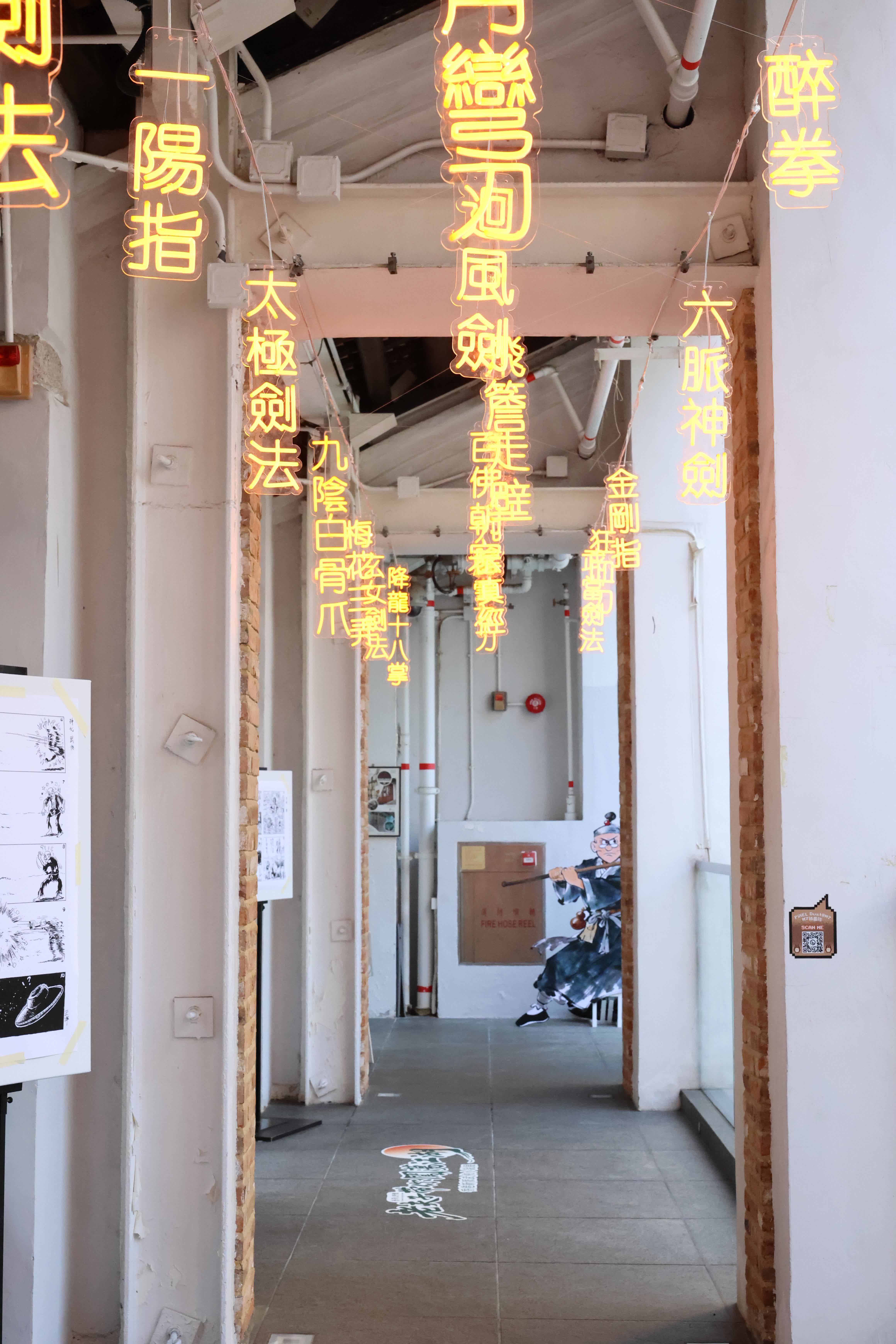 三樓「武俠不死」展區則進一步回到文學本身,分為「光影江湖」、「覺醒吧!我的武俠 DNA」及「新派武俠江湖山誰執筆」三個部分。「光影江湖」為一條長廊,沿途展示老夫子漫畫作品,並在頭頂懸掛以燈光呈現的武術話題關鍵詞,如「醉拳」、「太極劍法」等,營造出穿梭武俠世界的沉浸氛圍。其餘展區透過互動測試引發觀眾對角色屬性的聯想,並系統介紹香港新派武俠小說的代表作家與經典作品,梳理其文學脈絡與發展特色。