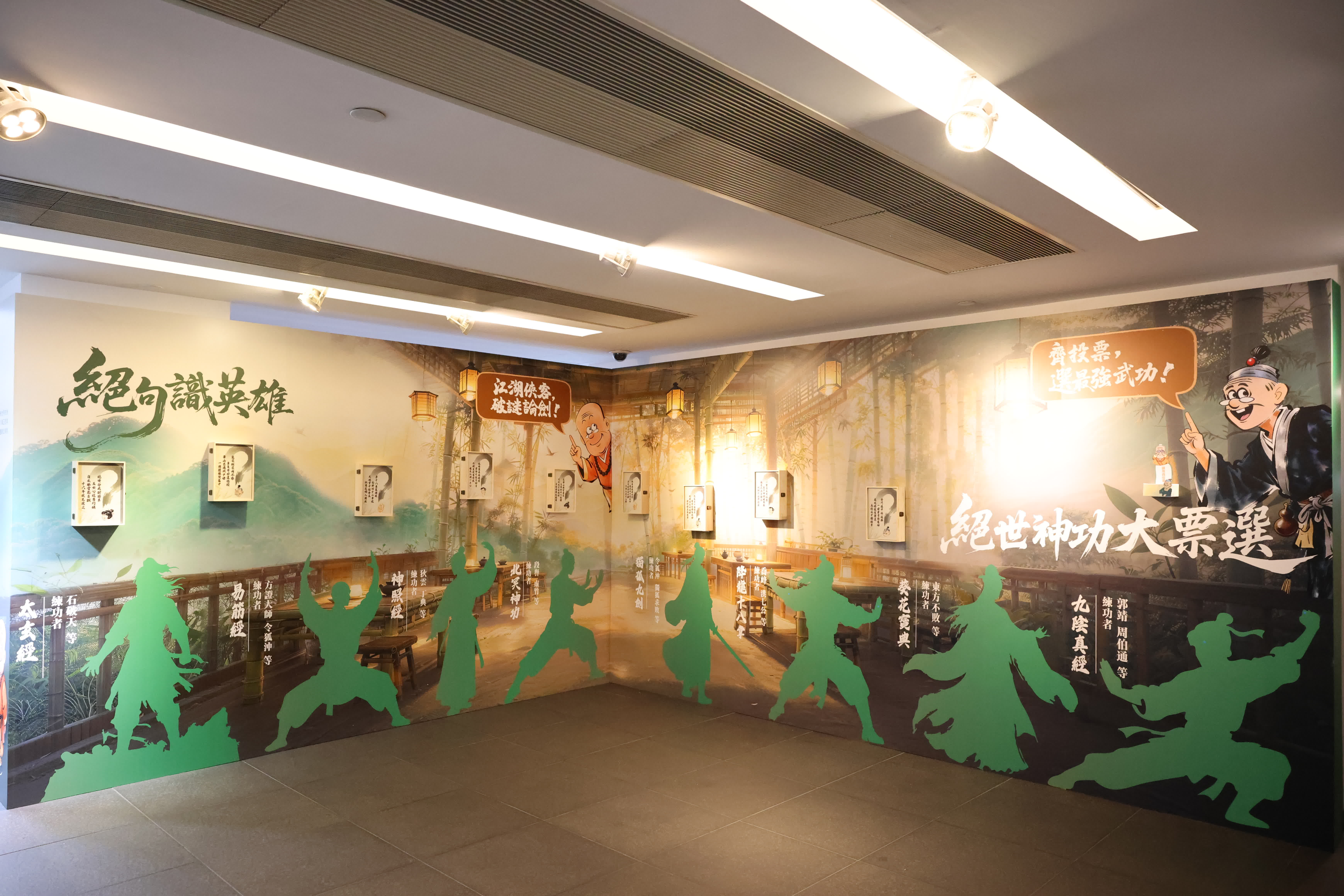 二樓「江湖試煉場」以「文武雙全」為概念,設有兩項互動體驗。「絕句識英雄」以九組詩句作為線索,觀眾可打開對應的盒子查看答案,辨識武俠小說中的經典人物,從閱讀、記憶與流行文化的角度,重新感受武俠小說的魅力。觀眾還可參與「絕世神功大票選」活動,討論心目中的「天下第一」武功。