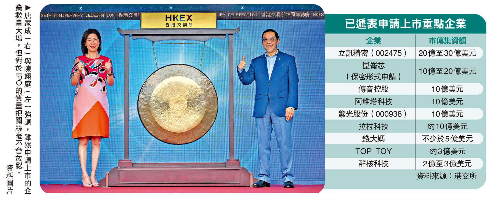 唐家成及陳翊庭強調,雖然申請上市的企業數量大增,但對於IPO的質量把關絲毫不會放鬆。此外,他們上月中參加了瑞士達沃斯論壇,收到了許多正面的反饋,越來越多的全球投資者表達了對港股市場的興趣,以及期望可以提供更加多元化的產品。