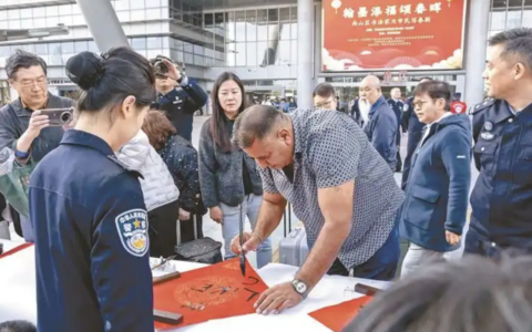 春節臨近的深圳灣口岸客流如梭,書法家們把書桌搬到出入境大廳門口,為趕路的旅客現場寫福送聯,這濃濃的年味不僅吸引了歸鄉的市民,也讓不少國際友人停下了腳步上前參與。