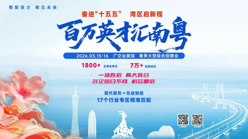 【識港網訊】3月15日至16日,「百萬英才匯南粵」2026年春季大型綜合招聘會將在廣州廣交會展館D區舉行。作為本次招聘會的創新亮點與「引導區」,長達350米的 「奮進之路」主題長廊以珠江為脈、以規劃為軸,全景式鋪展廣東「十五五」發展的宏偉藍圖,成為海內外人才讀懂灣區、選擇廣東的「第一扇窗」。