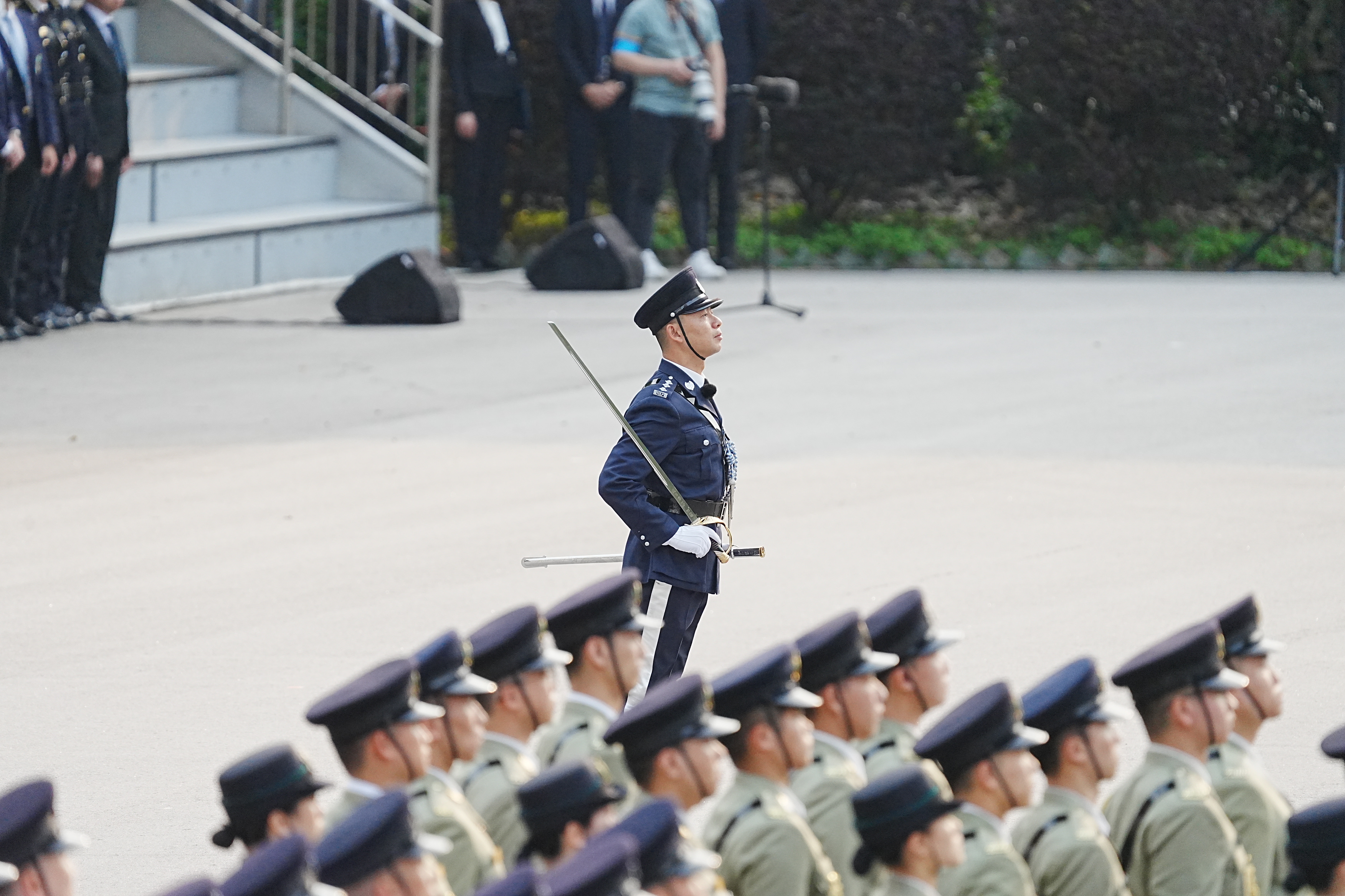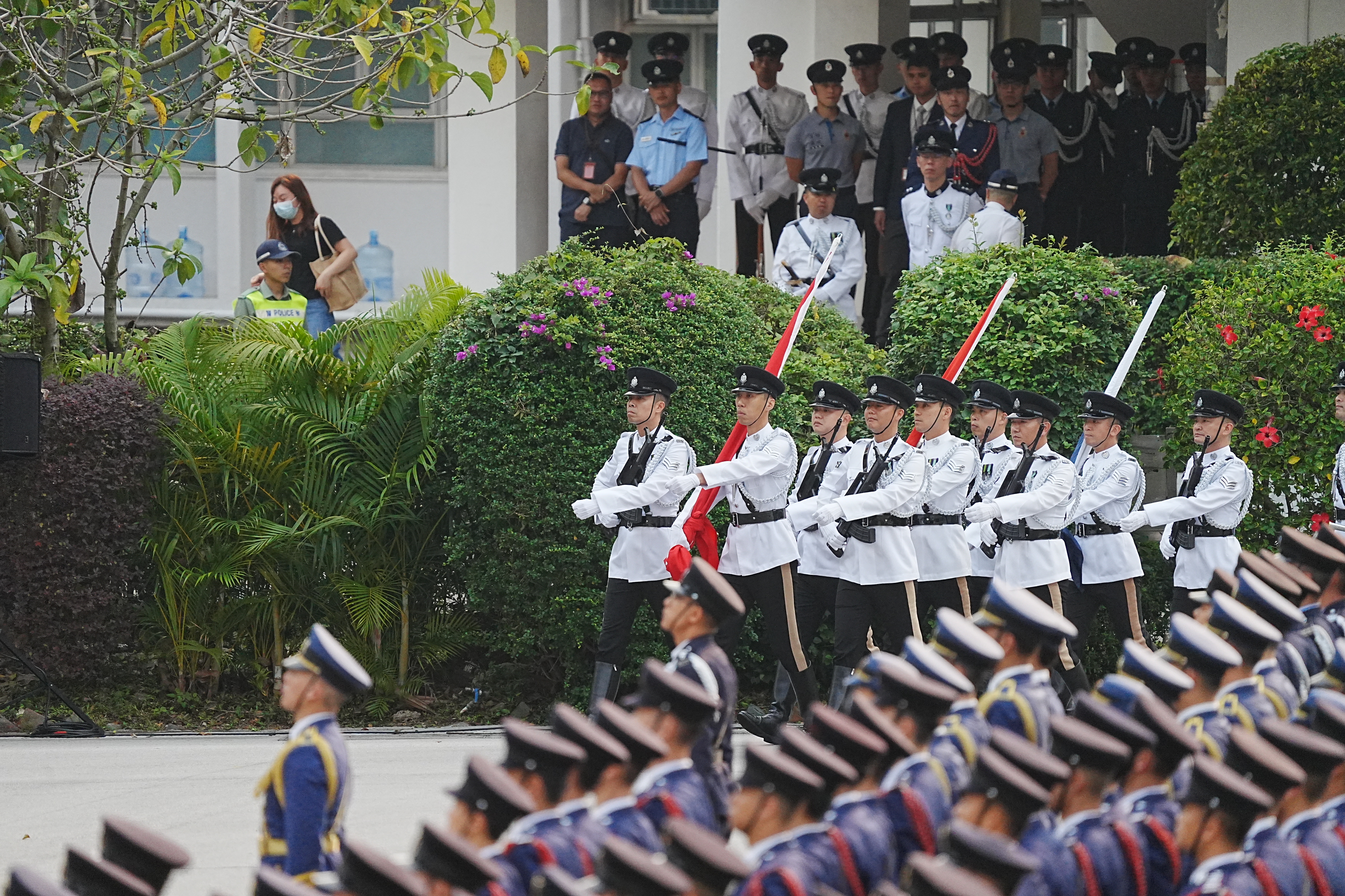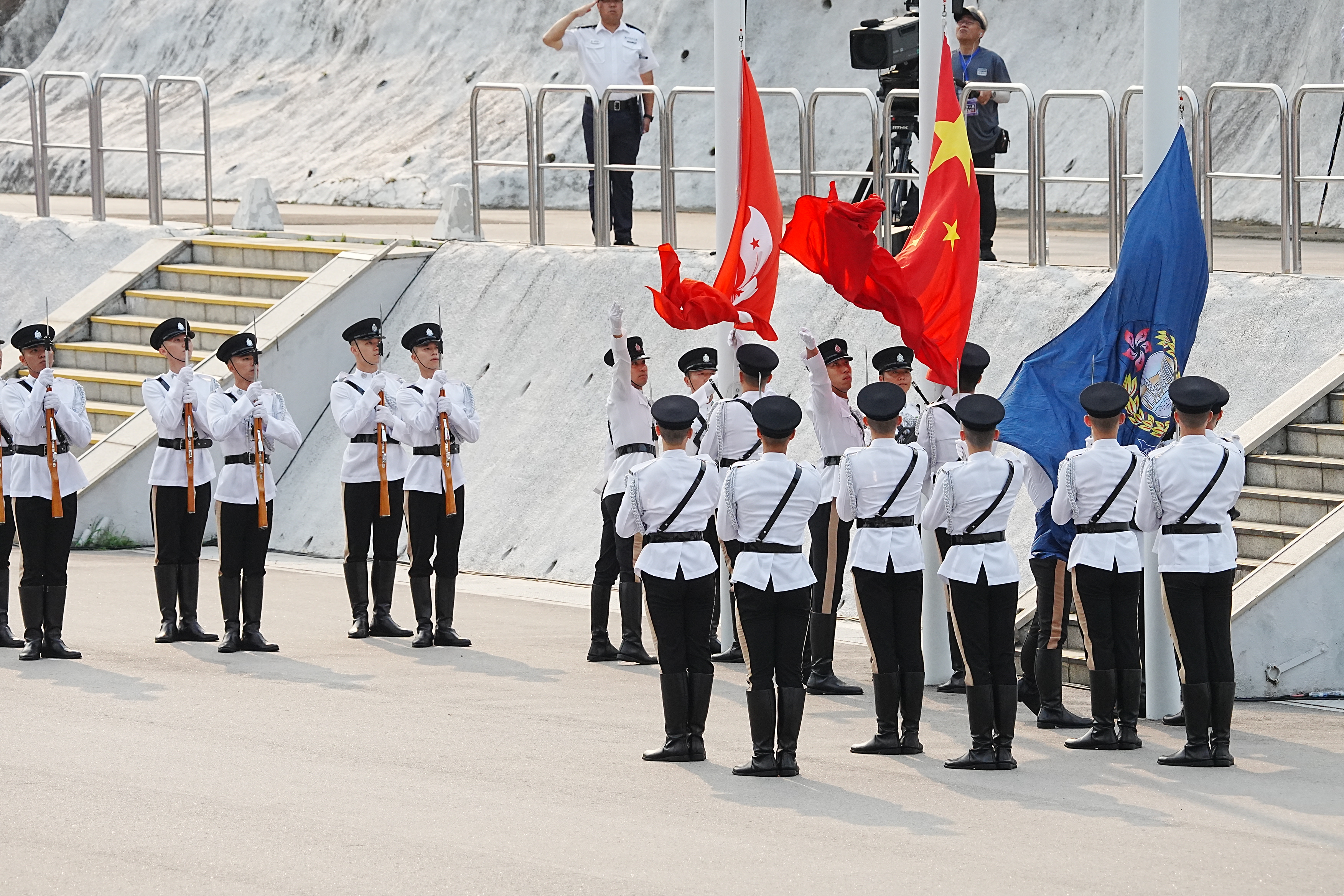 警察銀樂隊率先奏樂進場,表演多首樂曲,為儀式揭開序幕。紀律部隊儀仗隊隨後步操入場,警察護旗方隊升起國旗和區旗,現場奏唱國歌。升旗儀式結束後,政務司司長陳國基致辭。